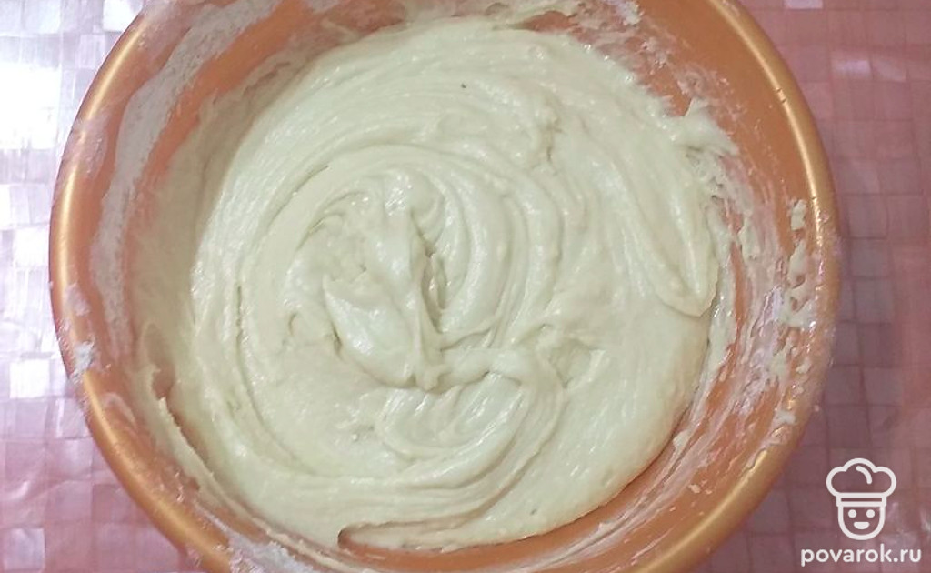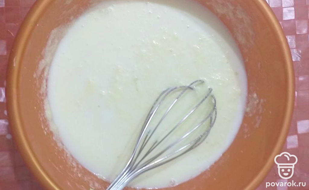 В отдельной миске соединить муку, и разрыхлитель, тщательно перемешать. Всыпать сухую смесь в жидкую, размешать до однородной констстенции.
