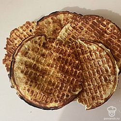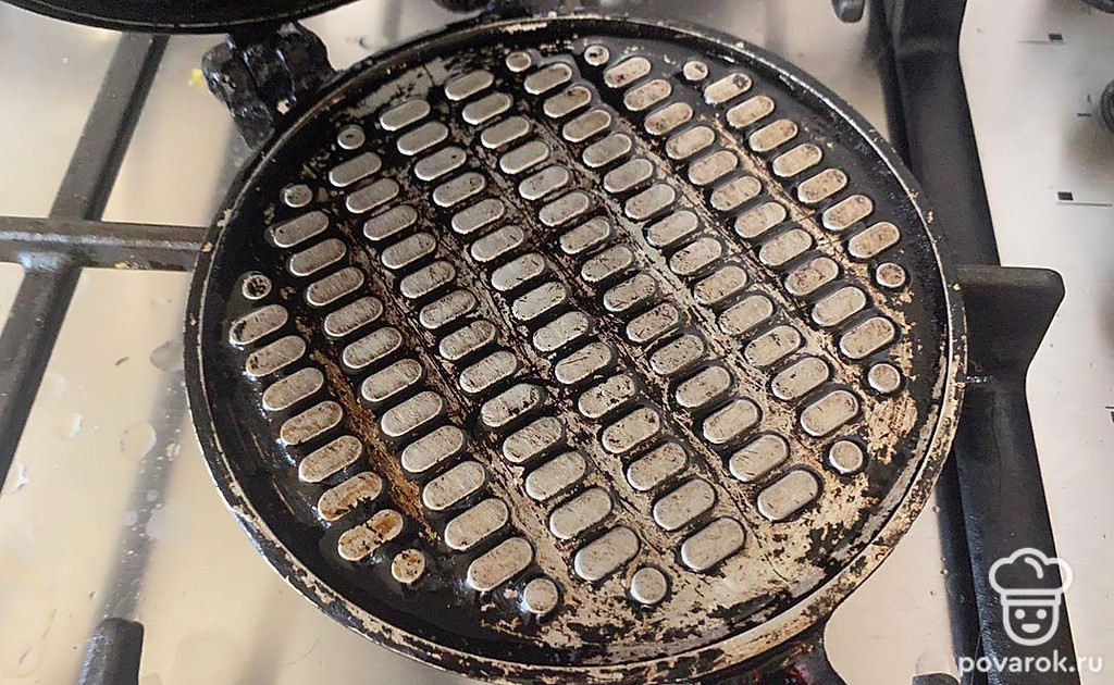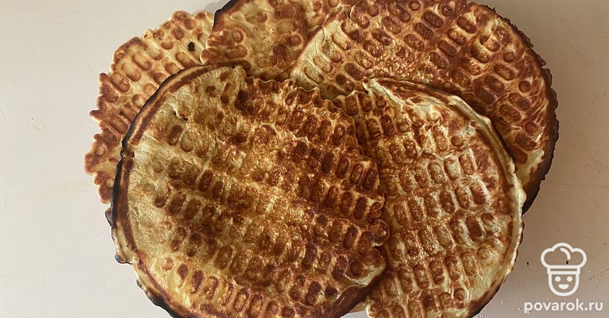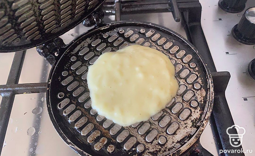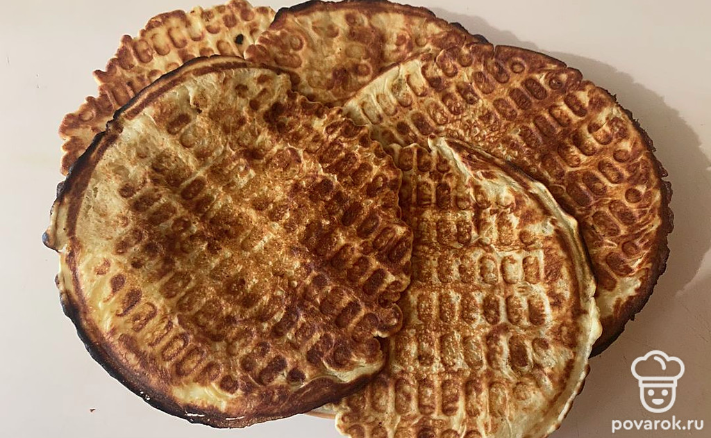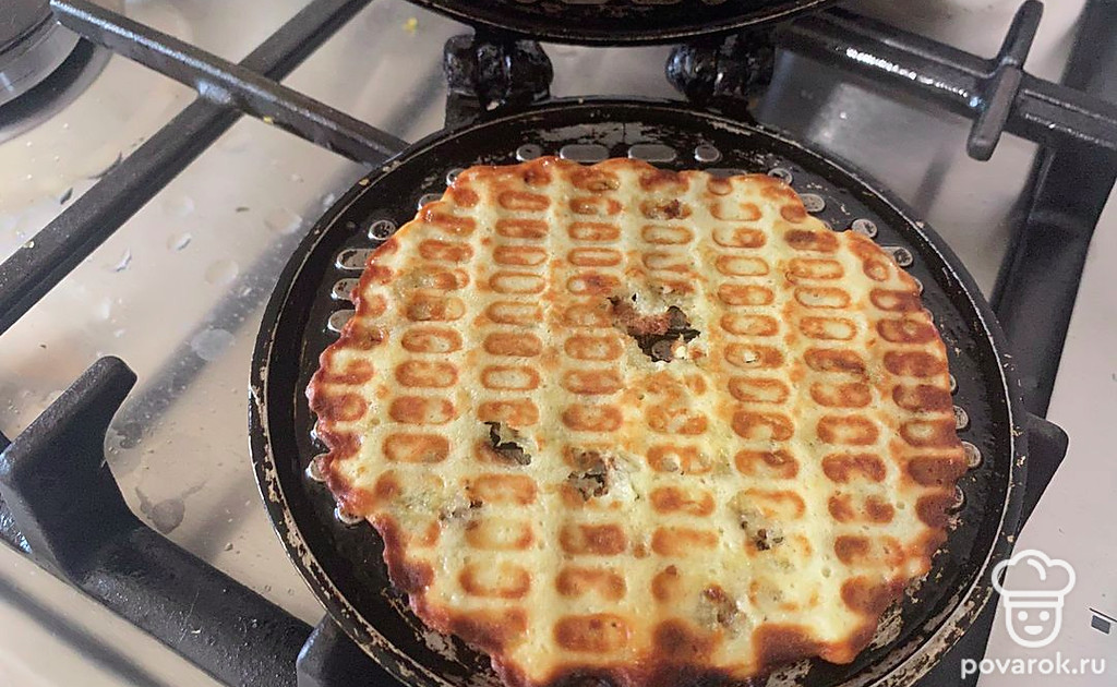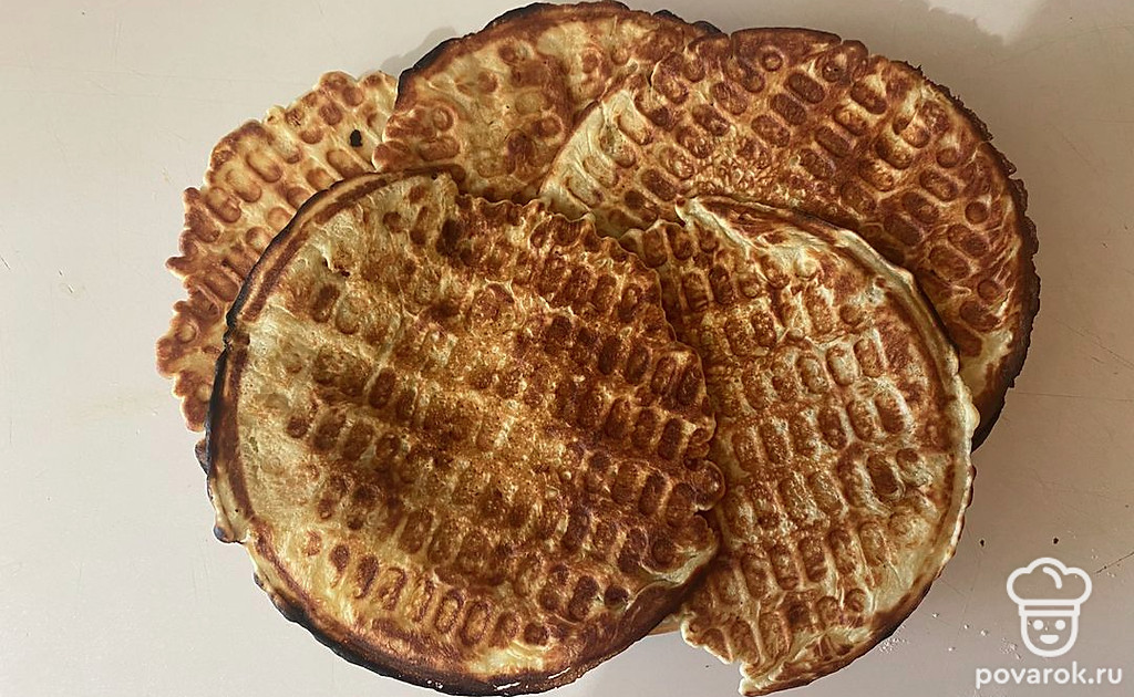 И обжаривайте каждую вафлю до золотистой корочки с двух сторон.
