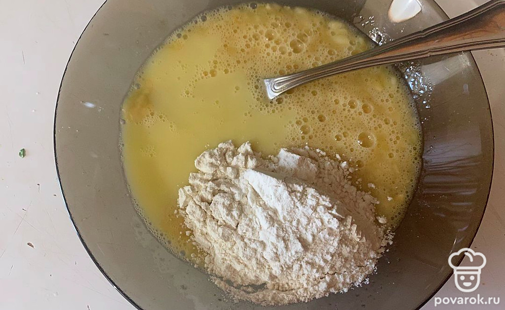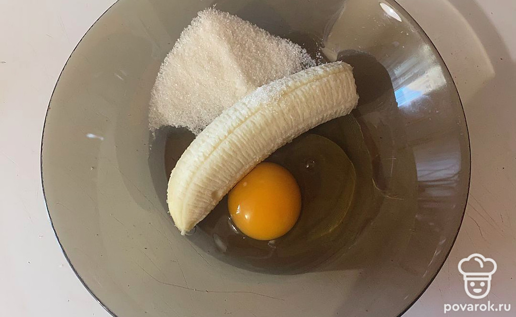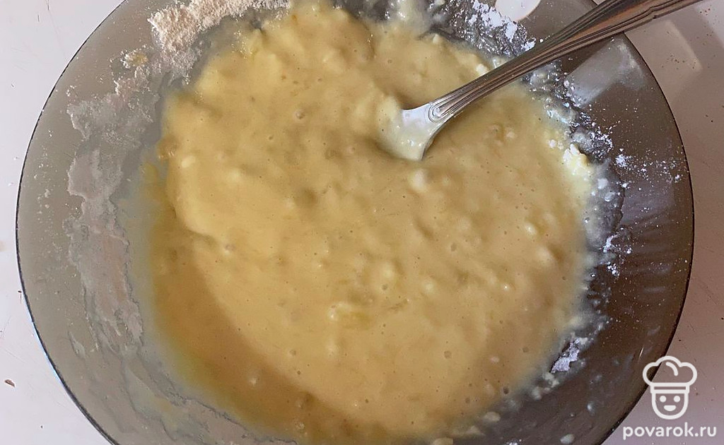 Далее к яичной-банановой смеси добавьте муку и растопленный маргарин.