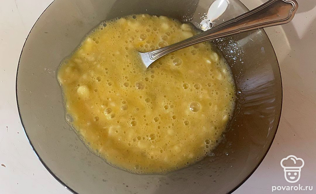 При помощи вилки перемешайте все ингредиенты между собой. Банан в пюре превращать не стоит - должны оставаться небольшие кусочки, чтобы они ощущались.