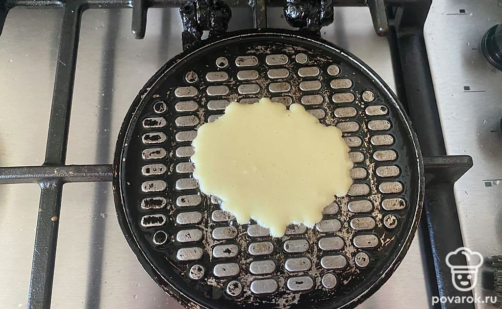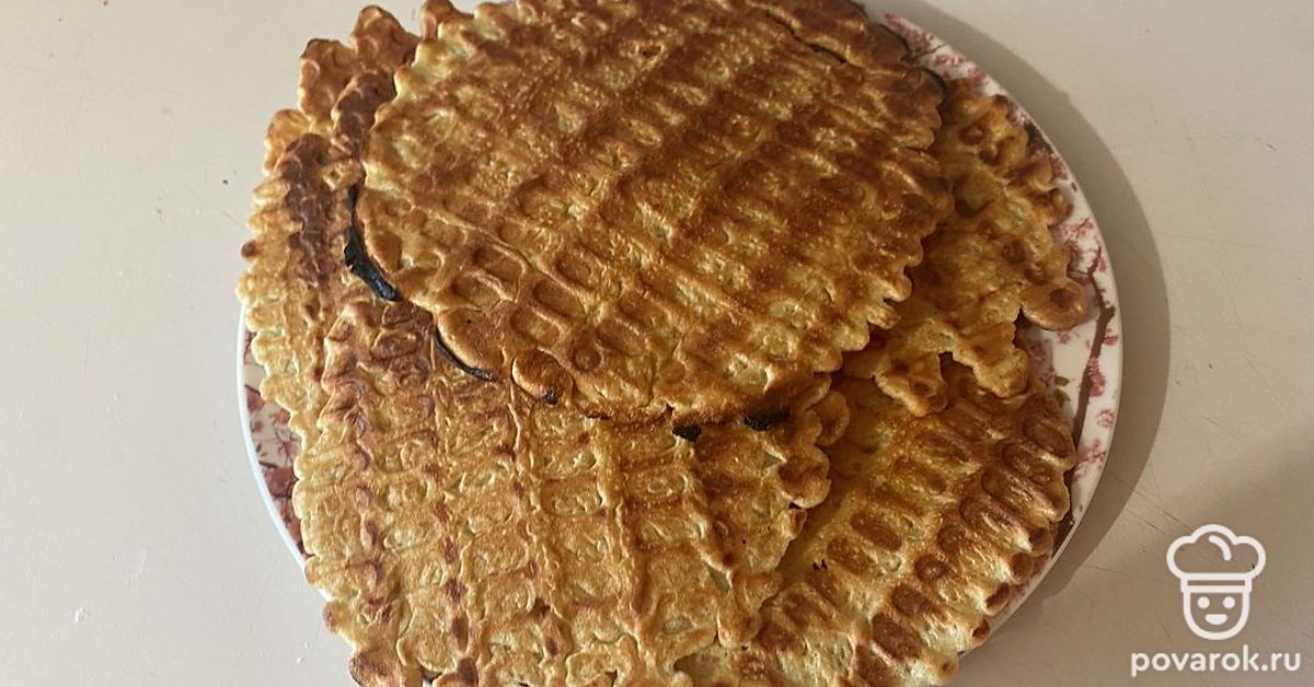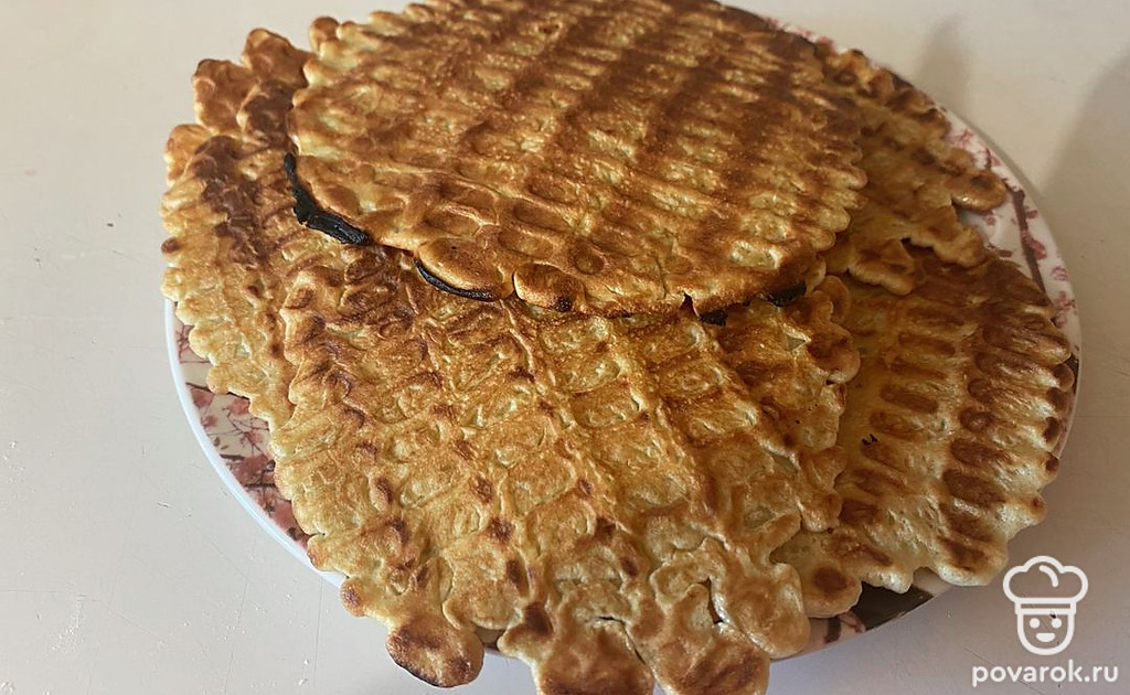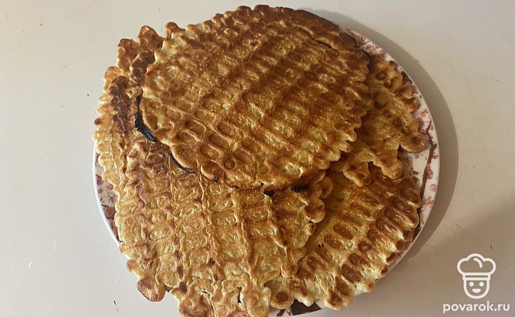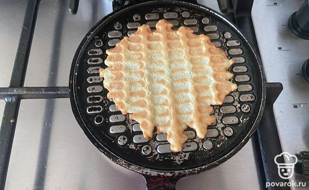 И обжаривайте каждую вафлю с двух сторон до появления золотистой корочки.