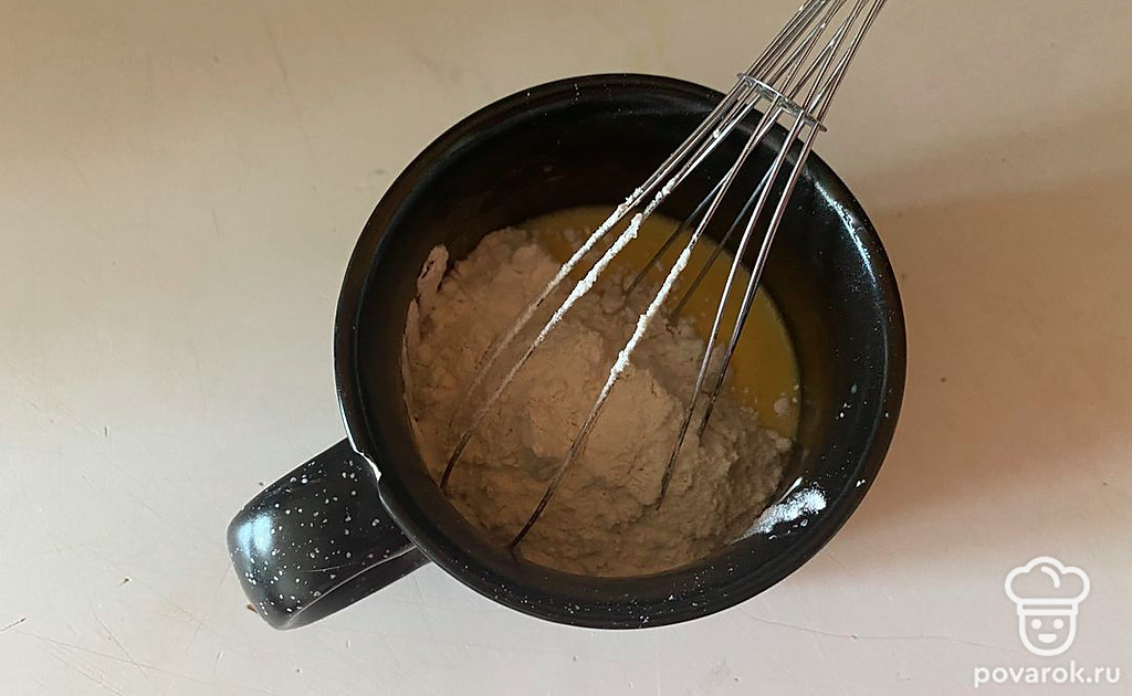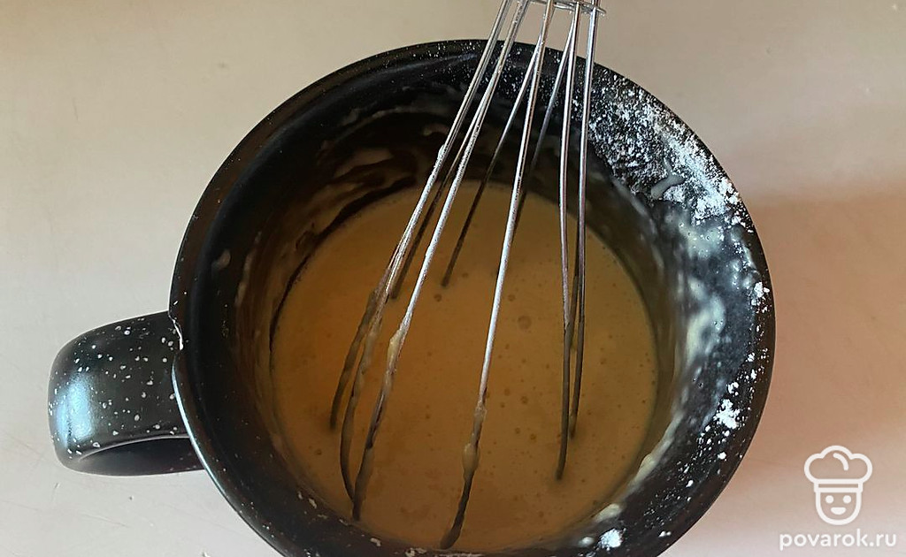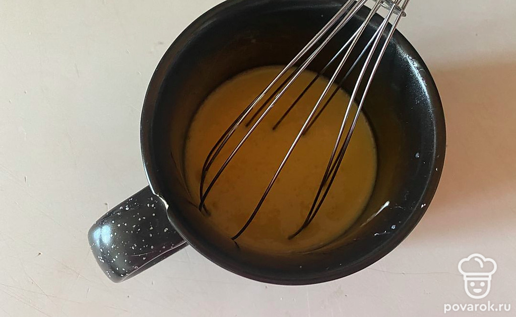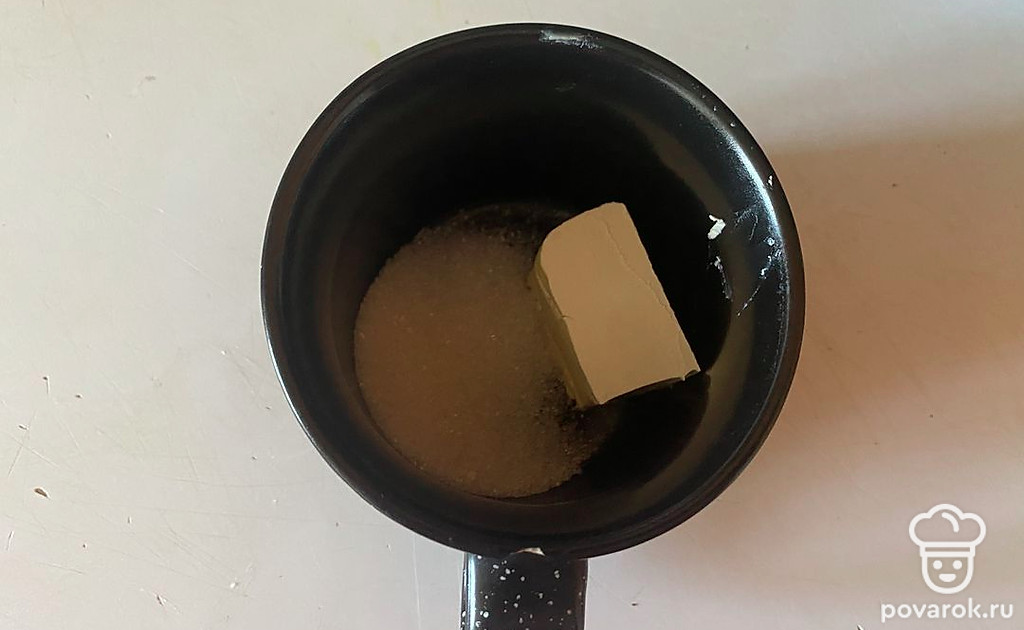 Растопите маргарин с сахаром до жидкого состояния в микроволновой печи в течении одной минуты.