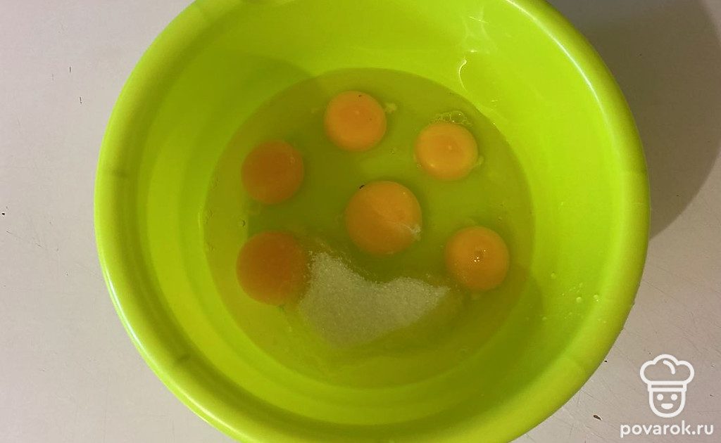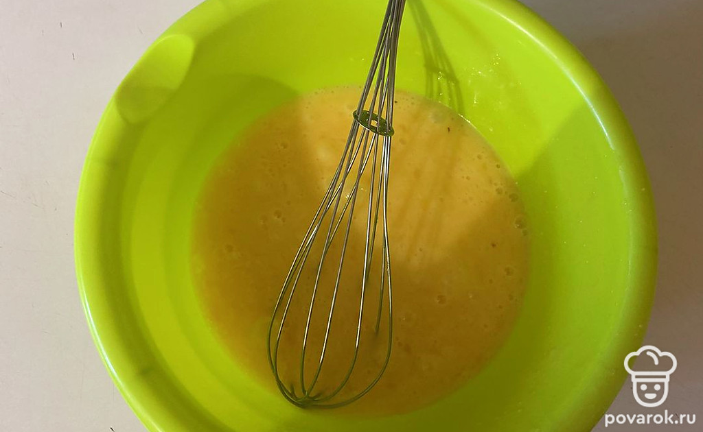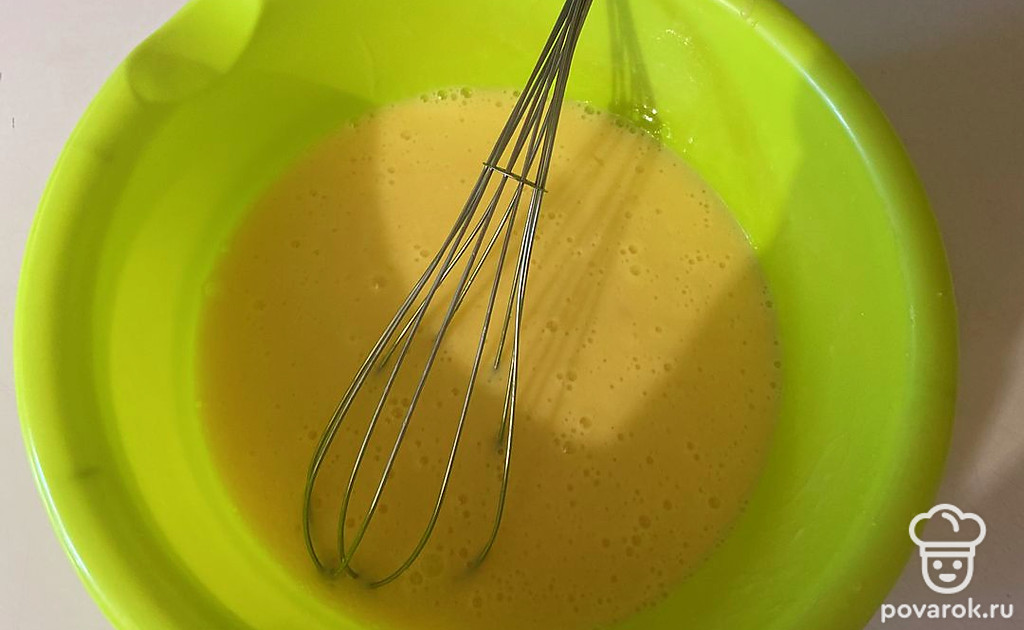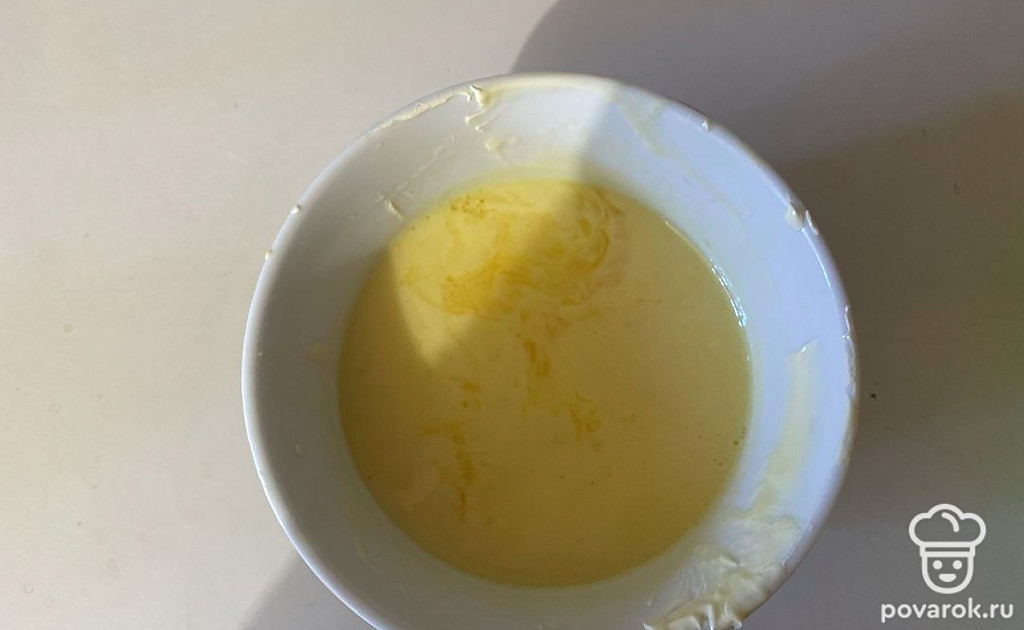 Влейте растопленный маргарин в яичную смесь и перемешайте.