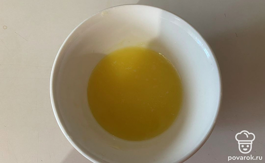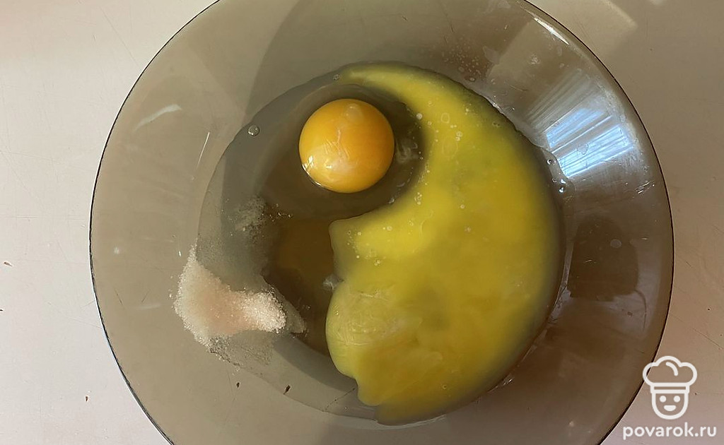 В посуде соедините яйцо, сахар и растопленный масла.