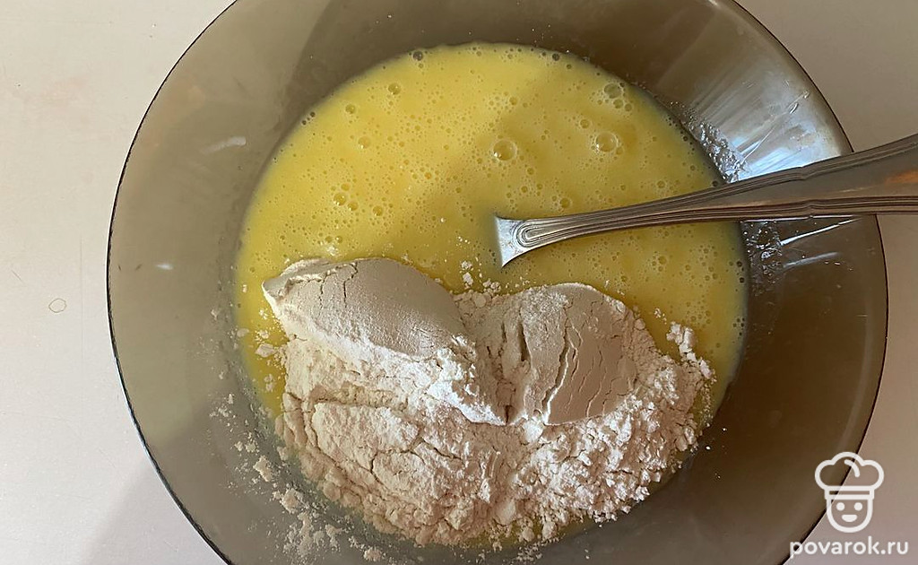 Затем добавьте туда муку и разрыхлитель теста.