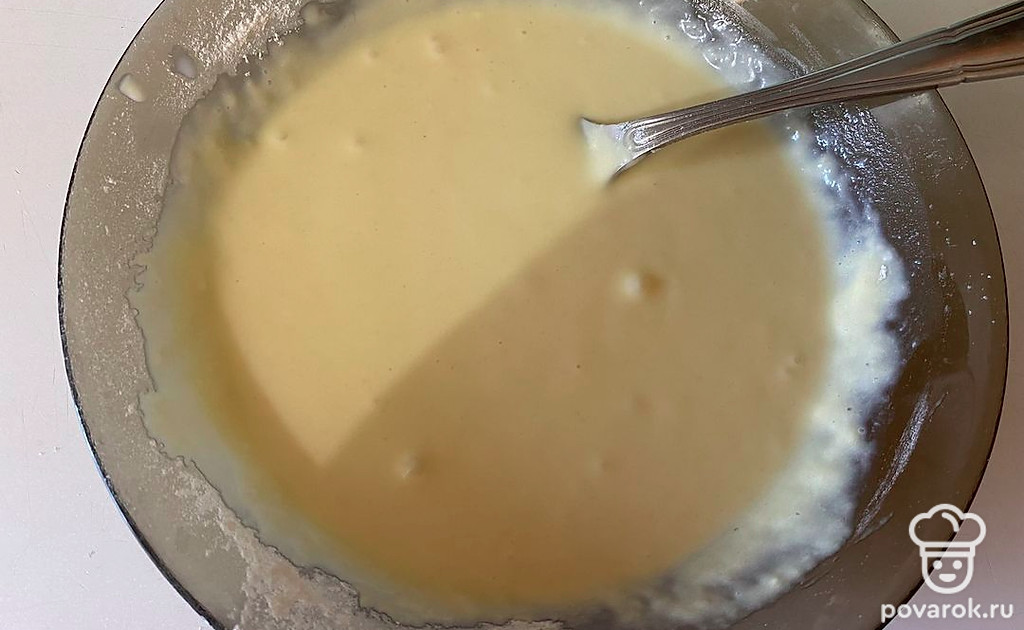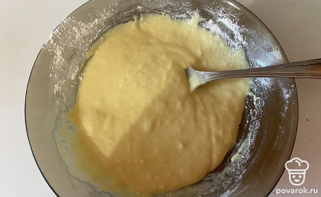 Перемешайте тесто до исчезновения комочков муки, тесто должно получиться немного тугое.