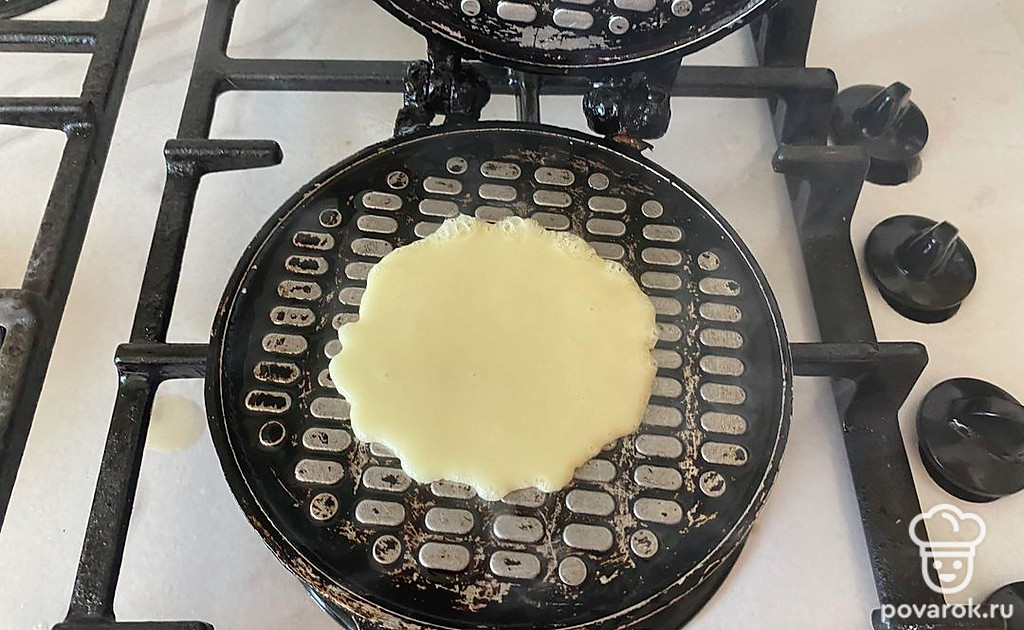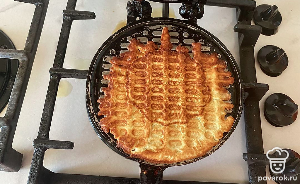 И обжаривайте вафлю до появления золотистой корочки в с двух сторон.