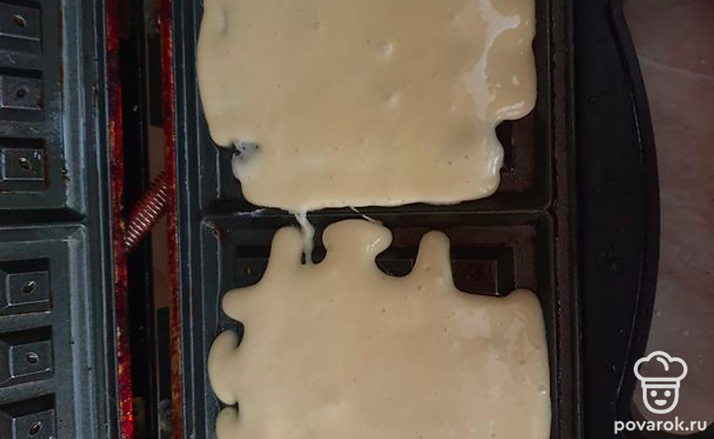 Разогреть мультипекарь, смазать пластины маслом. Налить тесто и выпекать с закрытой крышкой 6-7 минут.
