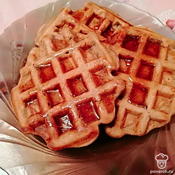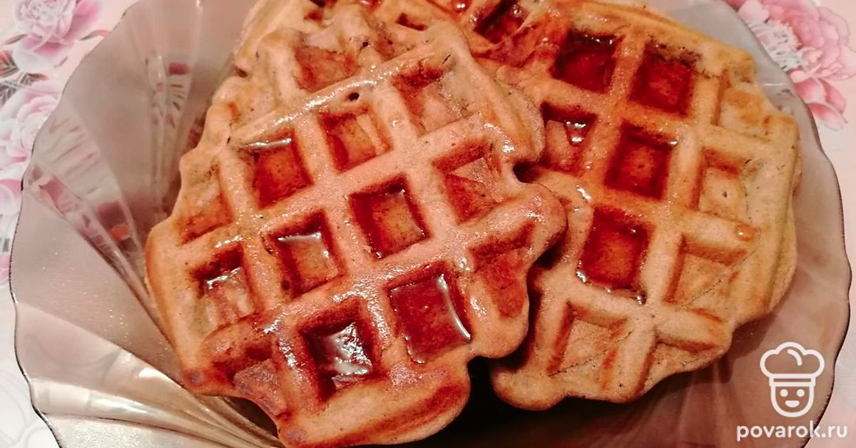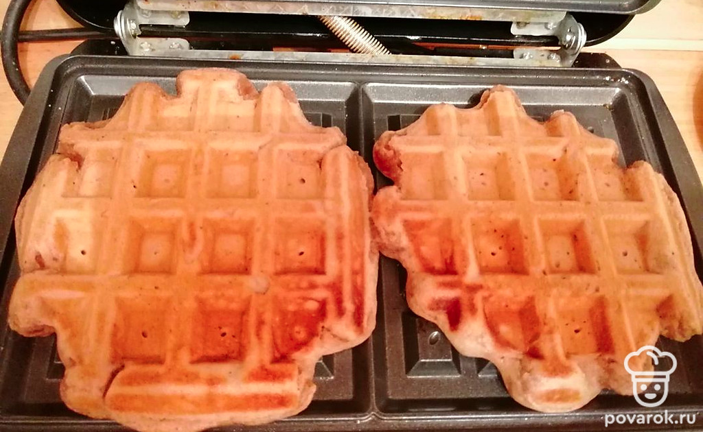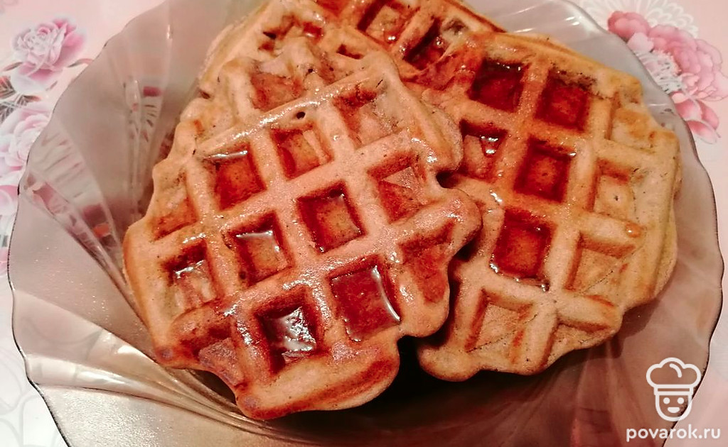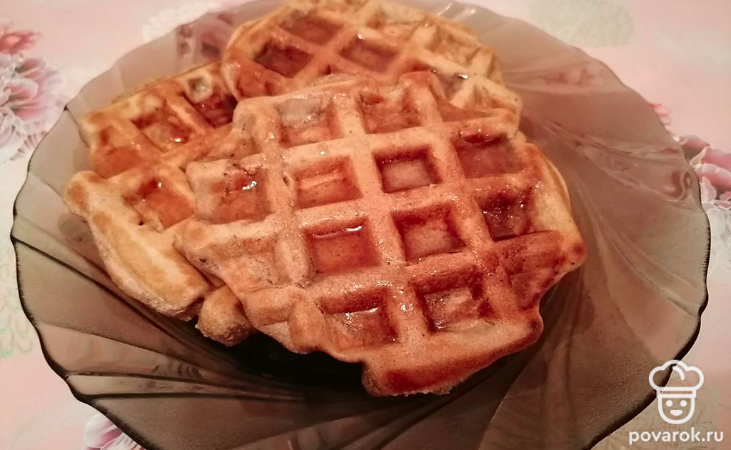 Полейте вафли любимым сиропом, т.к. по рецепту они получаются не очень сладкими. Этого количества теста хватает для приготовления 5 вафель. Приятного аппетита!