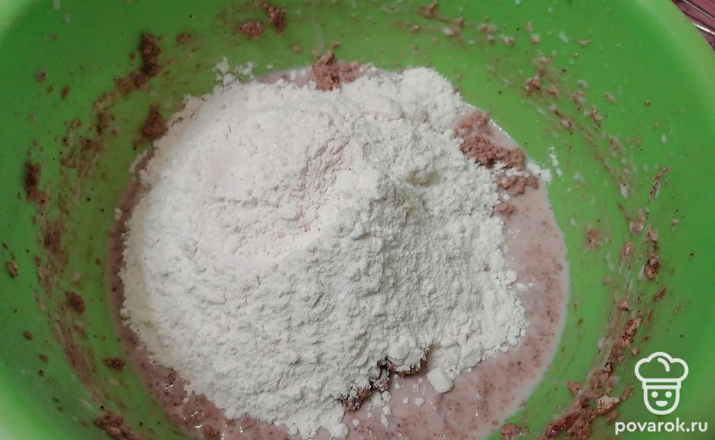 Влейте молоко, перемешайте, добавьте муку и щепотку соды.