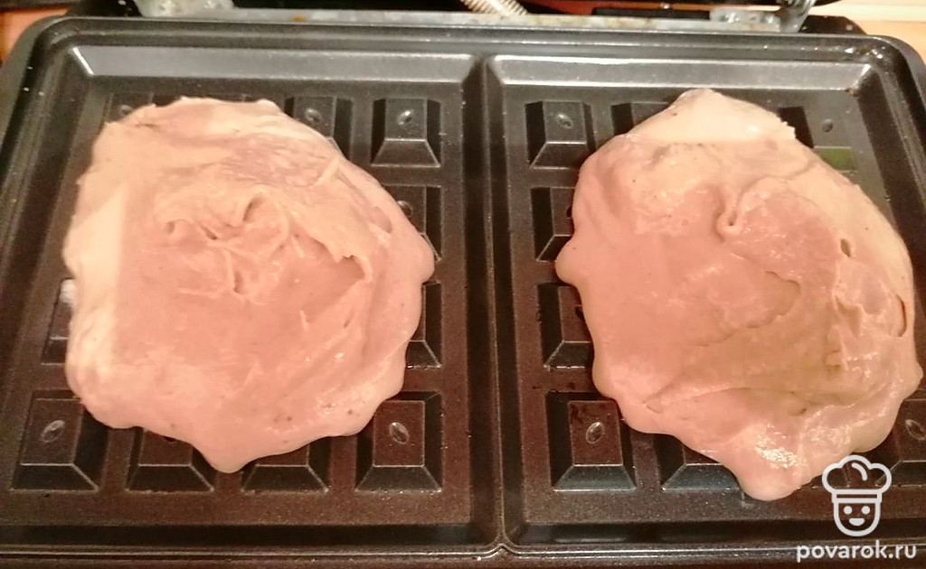 Хорошо прогрейте мультипекарь, на каждую панель положите примерно по две ложки теста и закройте.