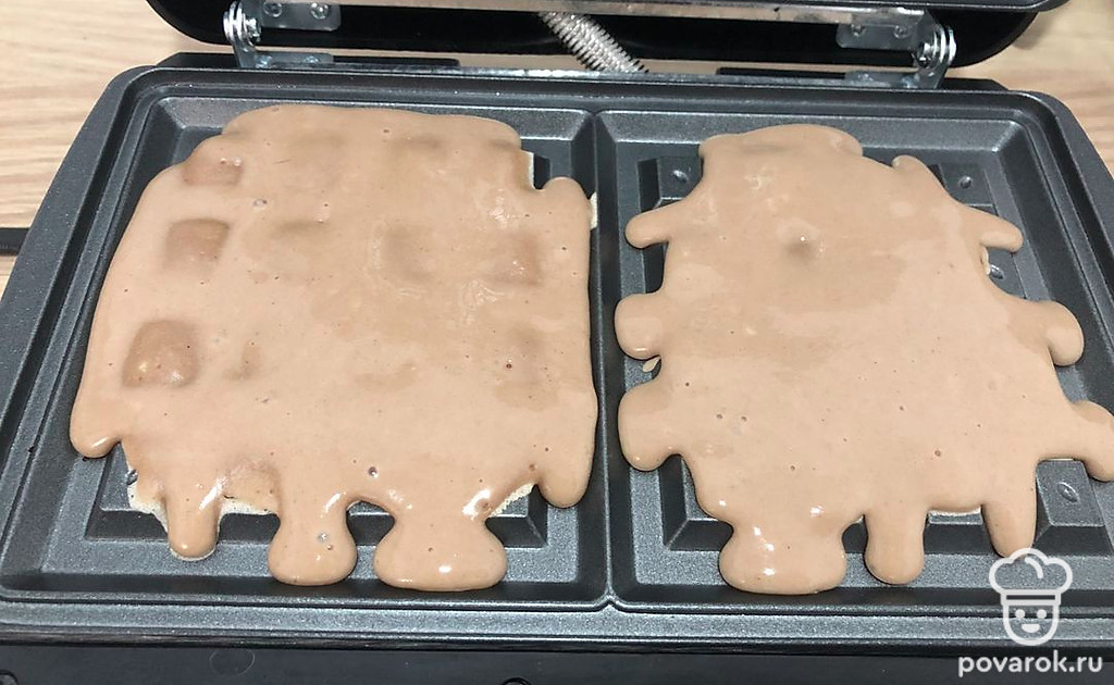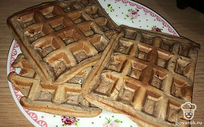 Получившееся тесто накладываем в вафельницу и ждём 10 минут. Готовые вафли выкладываем на тарелку. Блюдо готово.