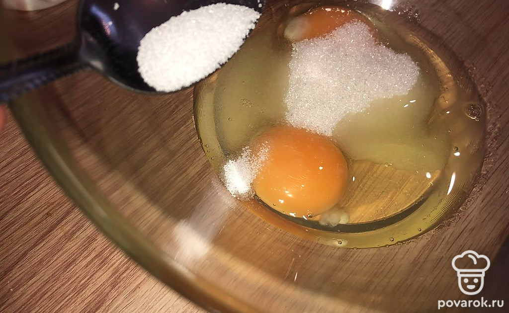 В миску разбиваем 2 яйца, добавляем соль, сахар и все перемешиваем.