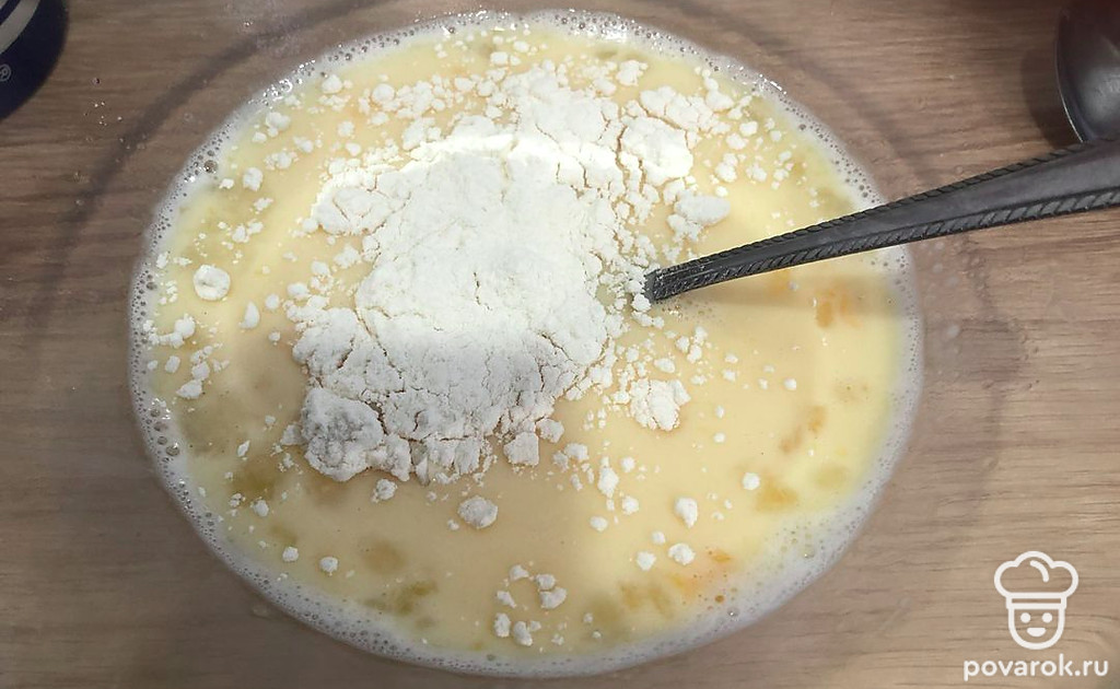 Далее аккуратно всыпаем просеянную муку и замешиваем тесто.