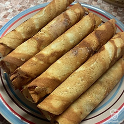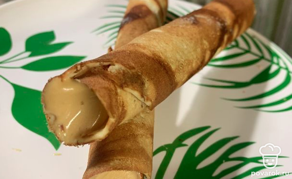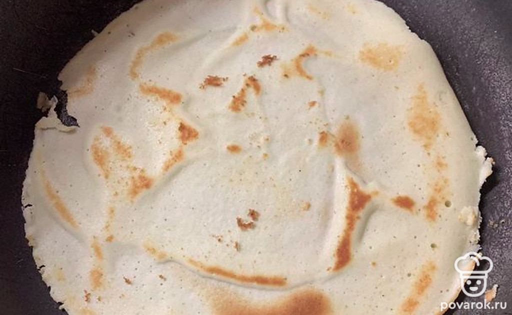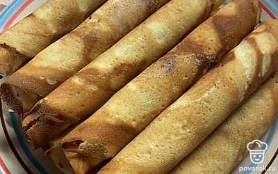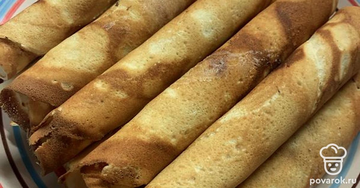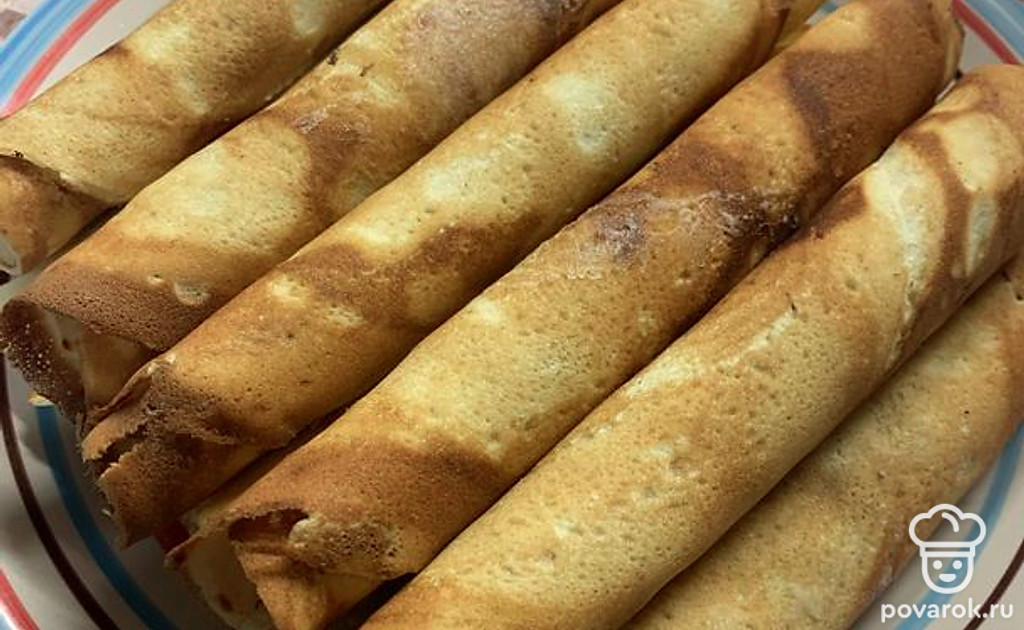 Обжариваем с двух сторон, убираем на тарелку и горячий блин сразу же закатываем в трубочку, иначе быстро застынет.