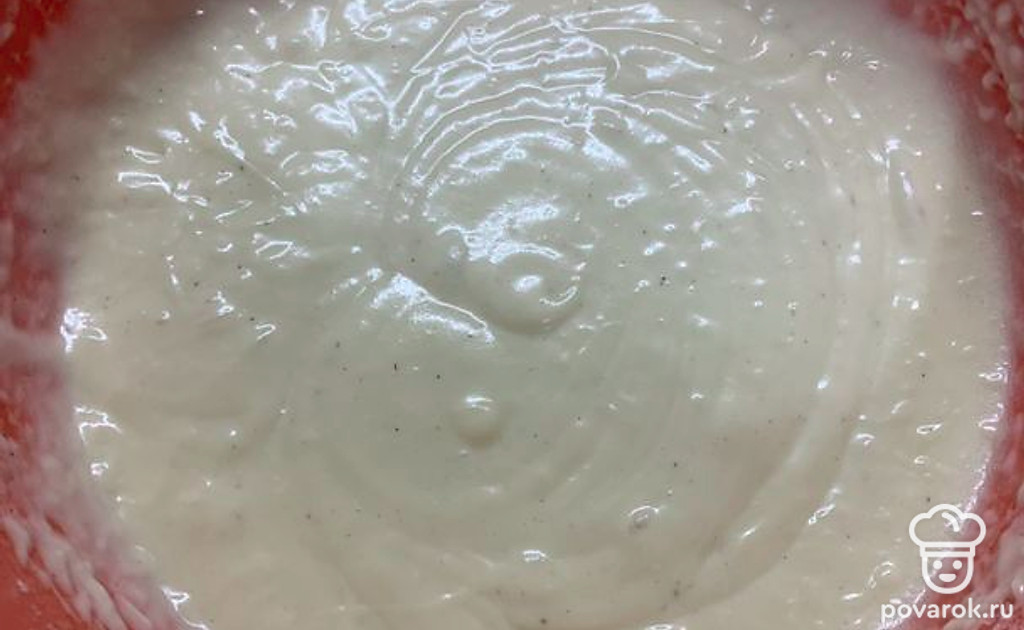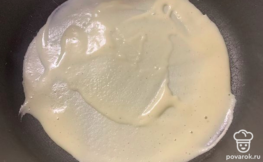 На раскалённую сковородку вливаем наше тесто и разравниваем силиконовой лопаткой. Сковородку маслом мазать не нужно, она должна быть антипригарная.