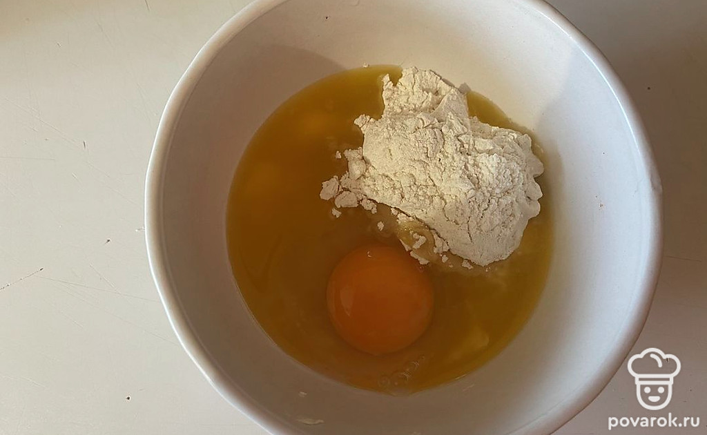 К маслу добавьте сахар, яйцо и муку.