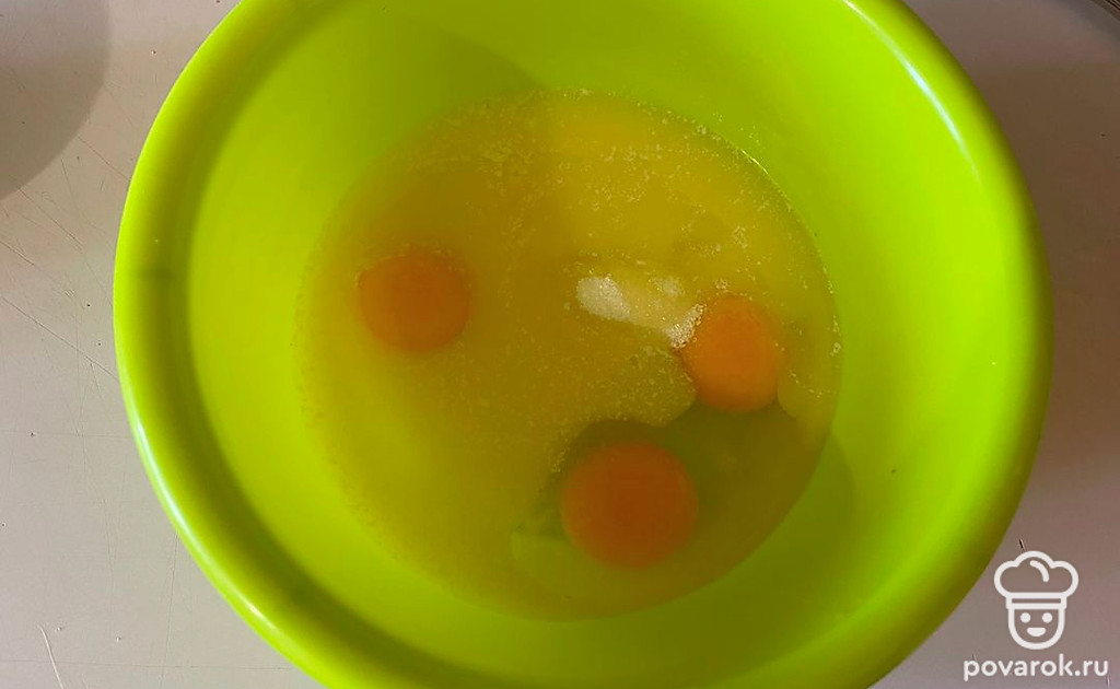 В миске соедините яйца, сахар и сливочное масло.