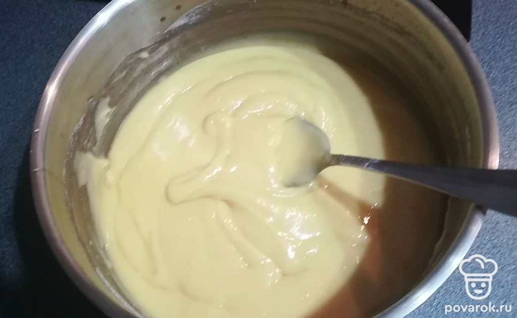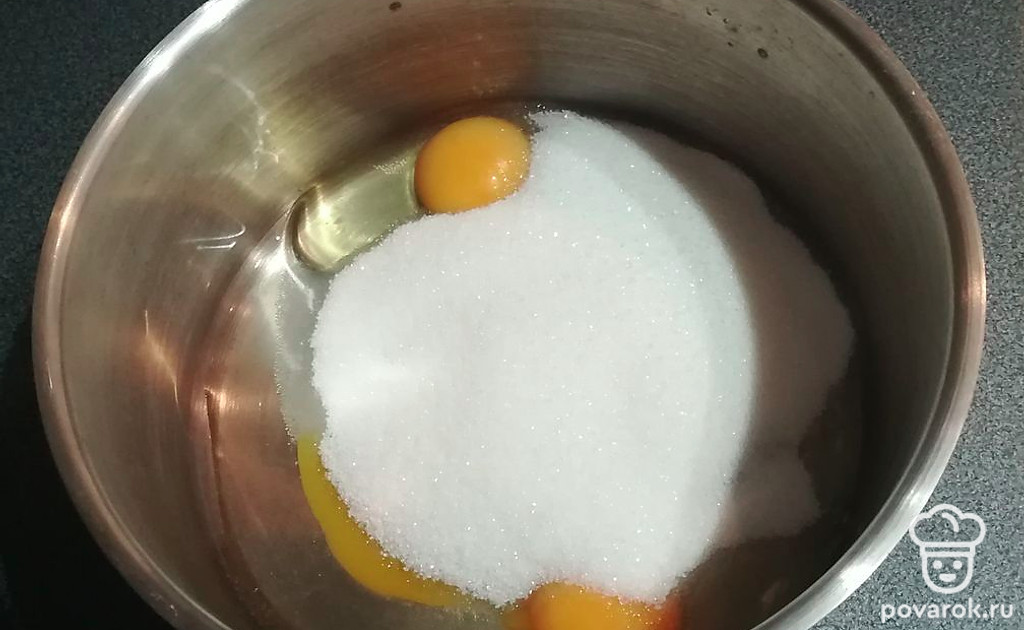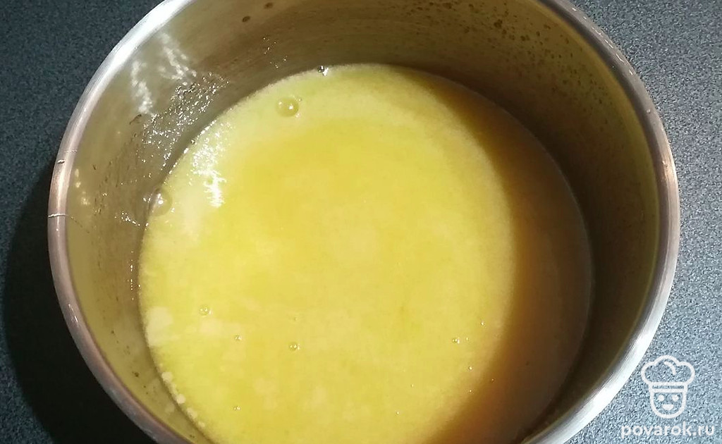 Добавьте сахар, все взбейте и добавьте растопленный маргарин, соль и соду.