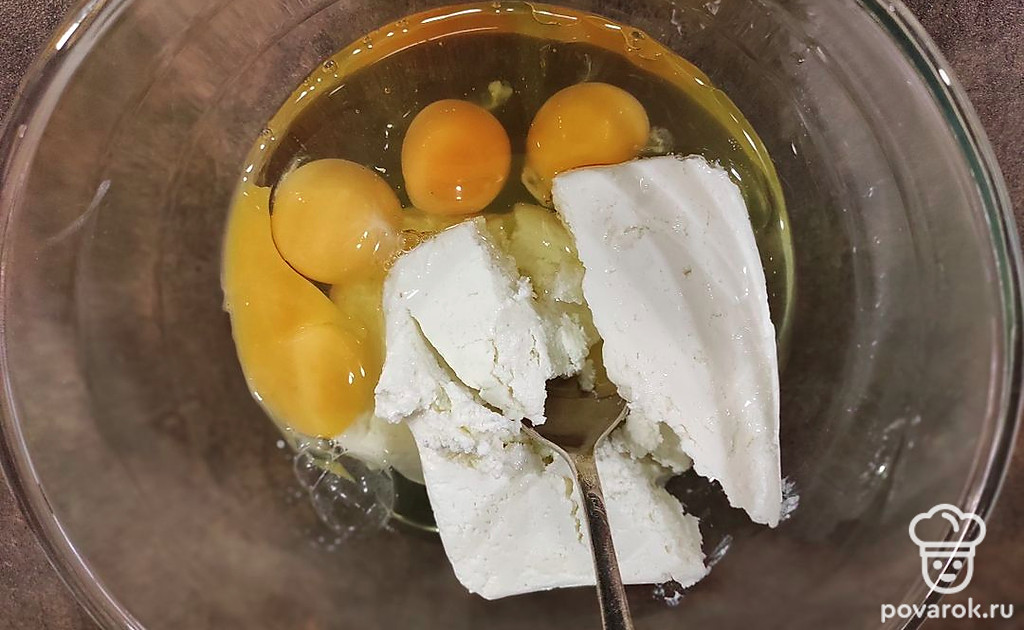 Смешайте творог с растительным маслом и яйцами. Добавьте сахар, соль, ванилин и соль, перемешайте до единой консистенции. Просеянную муку с разрыхлителем добавьте в тесто, перемешайте.