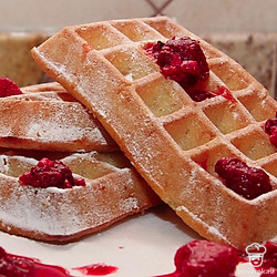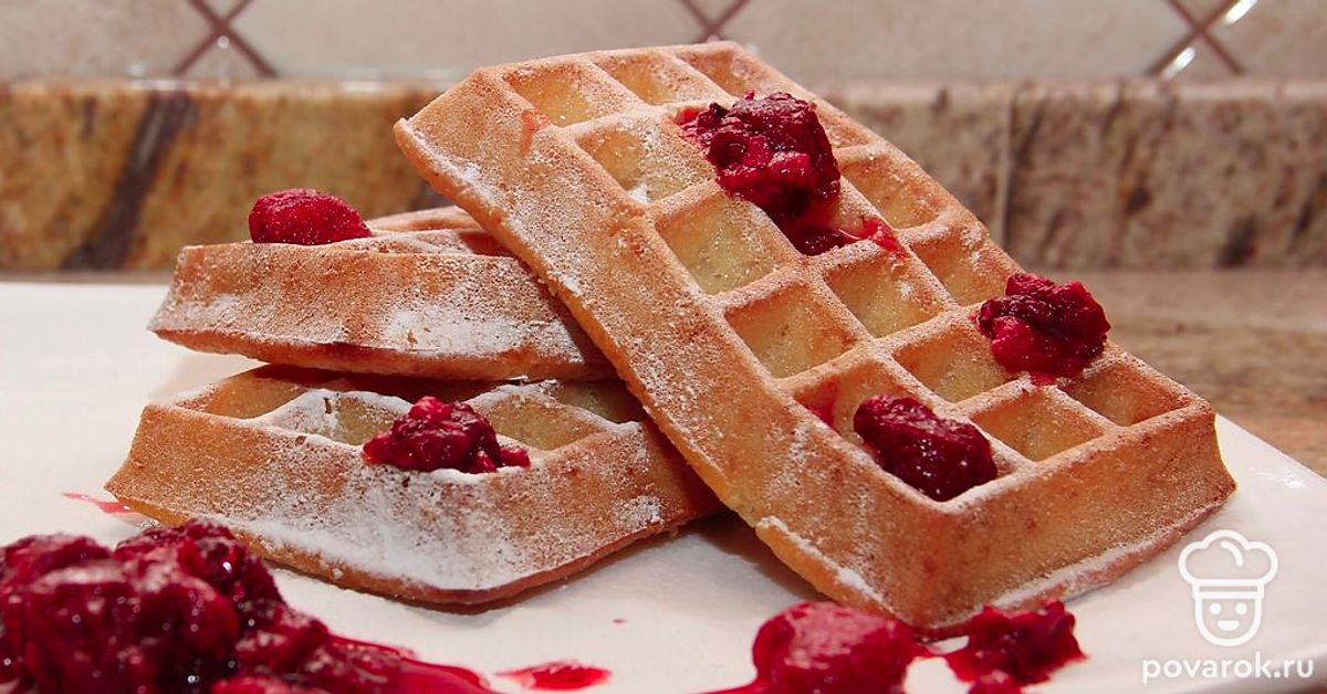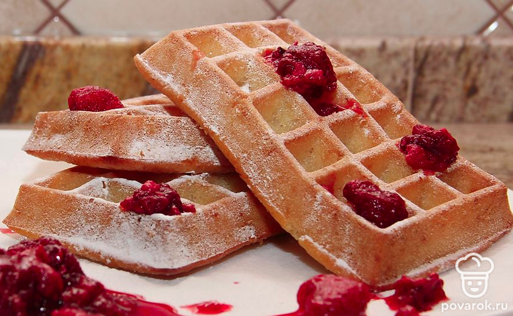 Дайте вафлям остыть, затем посыпьте сахарной пудрой и красиво разложите свежие ягоды или ягоды из варенья.
