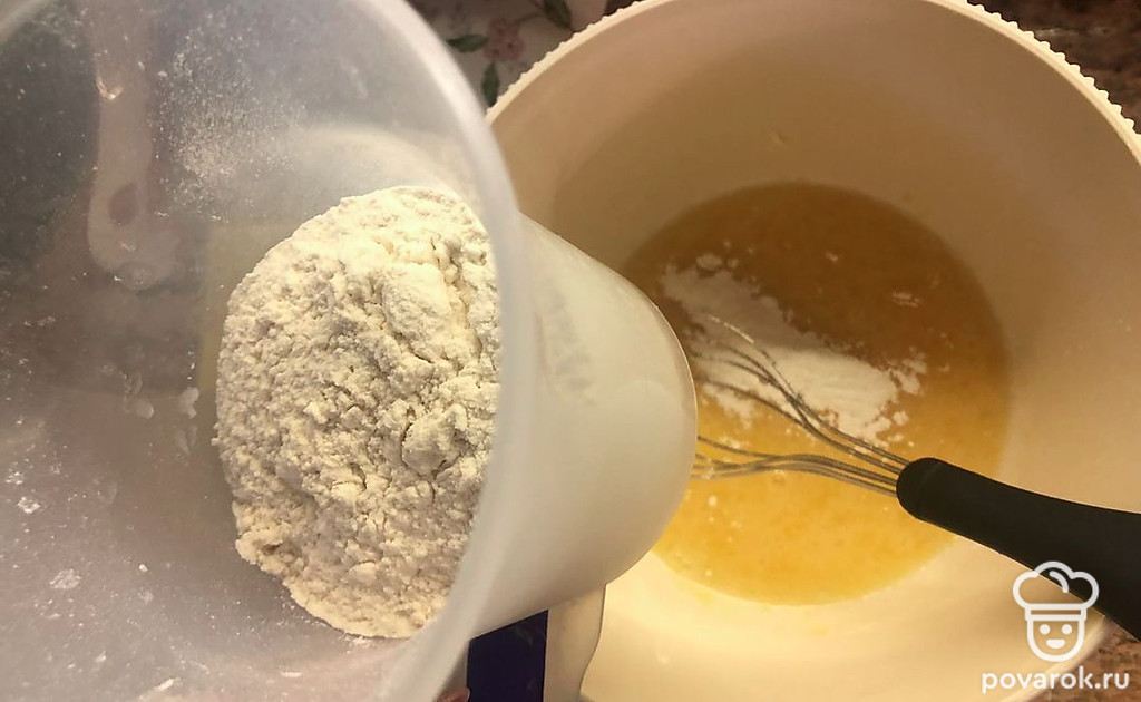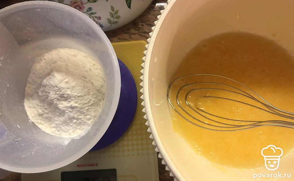 Просейте муку с разрыхлителем в получившуюся смесь и перемешайте до однородной консистенции силиконовой лопаткой.