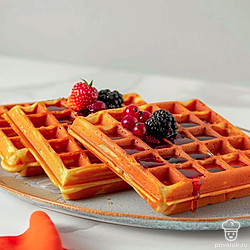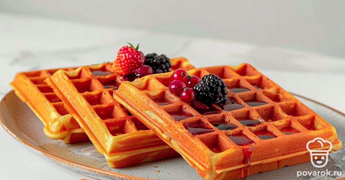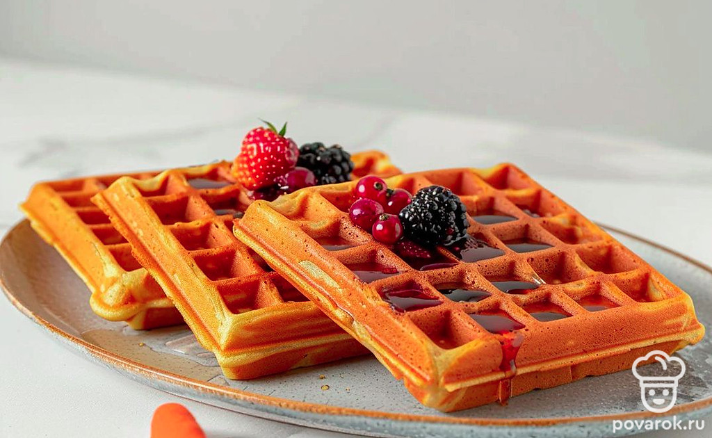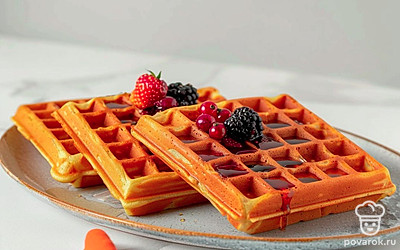 Полейте вафли ягодным сиропом и украсьте ягодами.