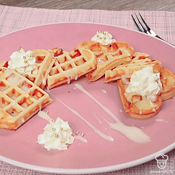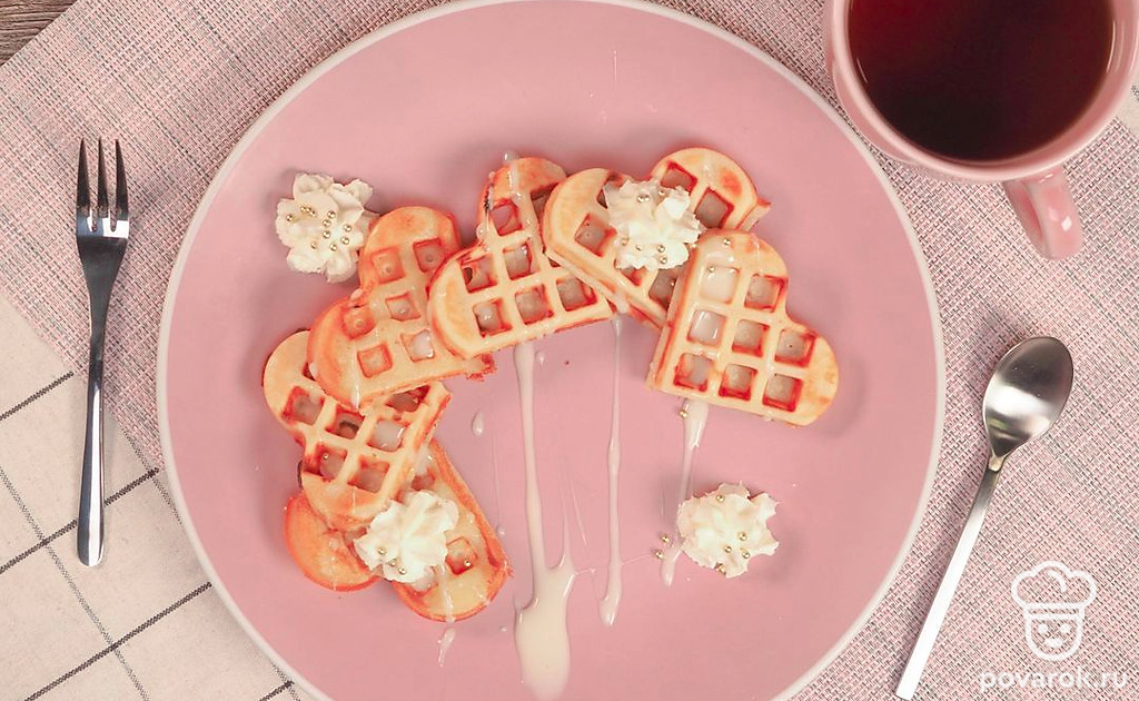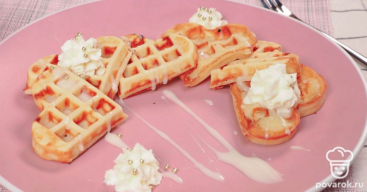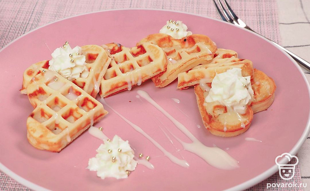 Домашние вафли можно подать со взбитыми сливками. Или добавить в качестве начинки вареную сгущенку. Для этого поместите ее в кондитерский мешок и выдавите в трубочку.