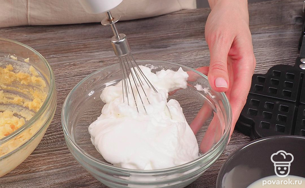 Для приготовления вафель в вафельнице на газу заранее достаньте масло из холодильника. Разделите его на кусочки и оставьте при комнатной температуре, пока оно не станет мягким. Белки отделите от желтков.