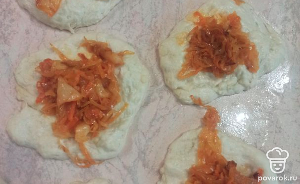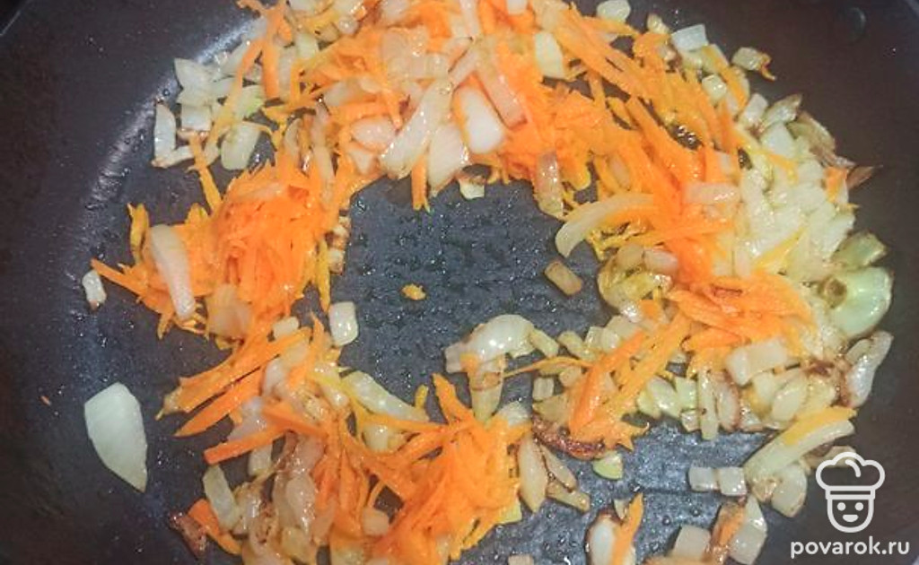 Сделайте начинку. Обжарьте нарезанный лук с тертой морковью.