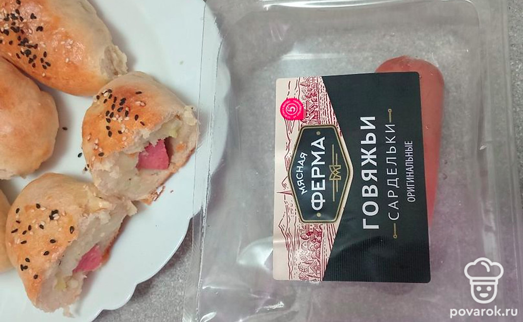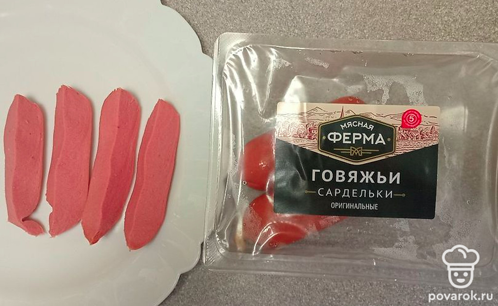Говяжью сардельку разрежьте вдоль на четыре части.