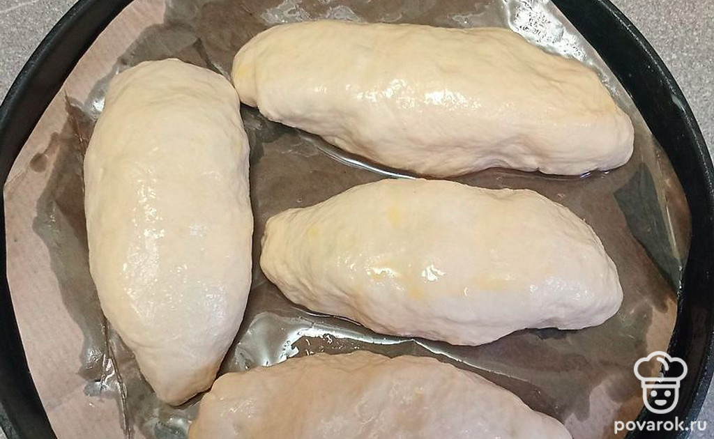 Выложите пирожки в смазанную растительным маслом форму. Смажьте пирожки яйцом.
