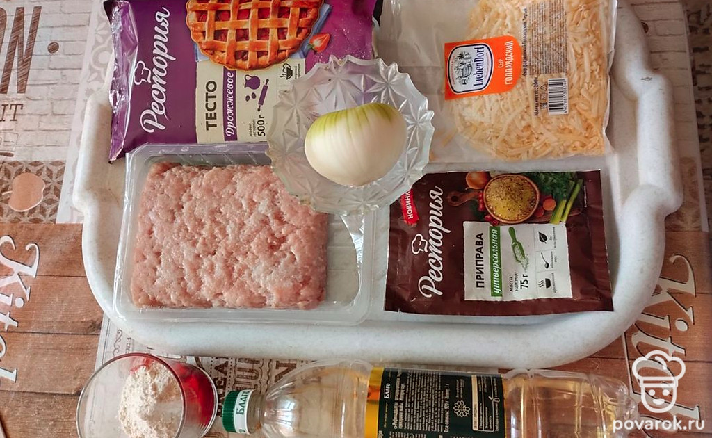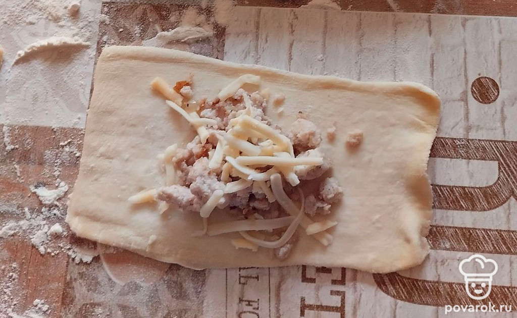 Слоеное тесто раскатайте, разрежьте на квадраты. На каждый квадрат выложите ложку куриного фарша и немного твердого сыра. Скрепите углы пирожка, смажьте каждый яйцом.