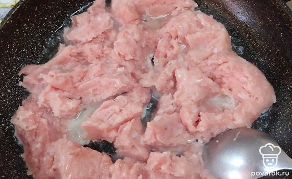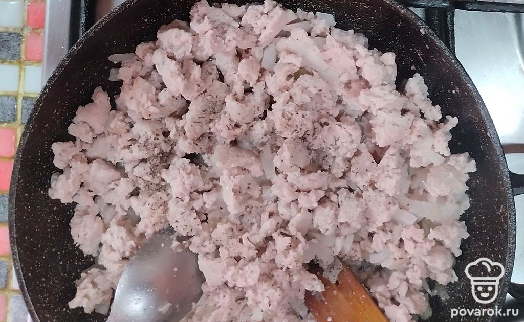 Обжарьте куриный фарш на разогретой сковороде с небольшим количеством растительного масла.