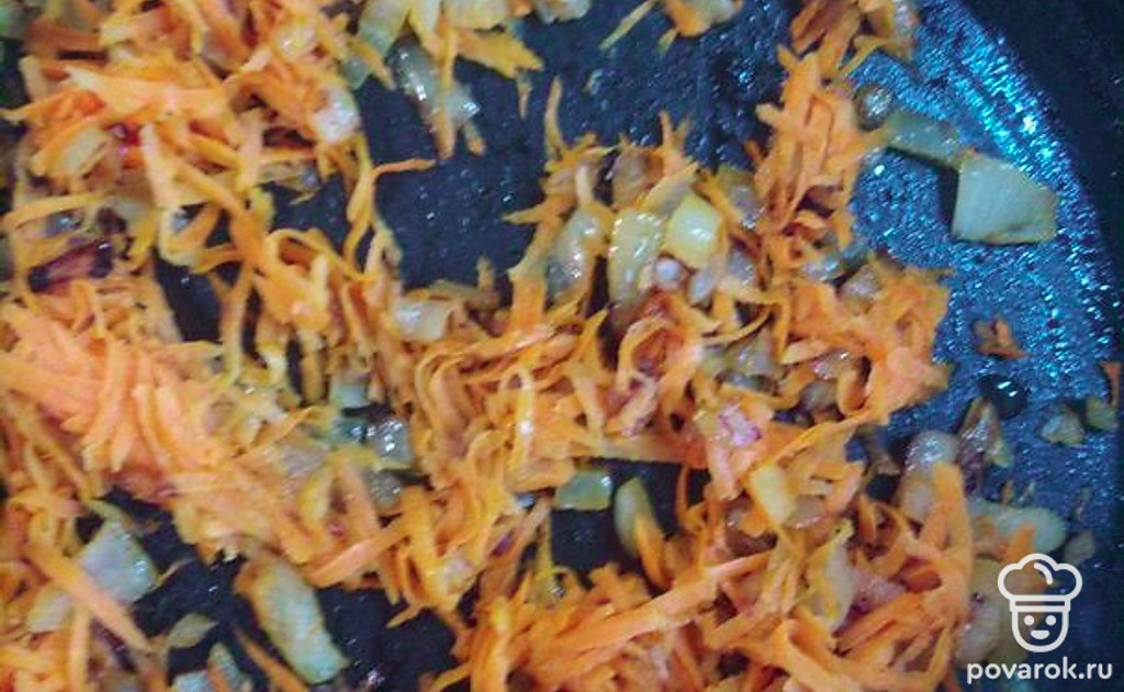 Приготовьте начинку. Потушите капусту с морковью и луком. Сначала нарежьте и обжарьте лук, потом нашинкуйте и добавьте к луку морковь.