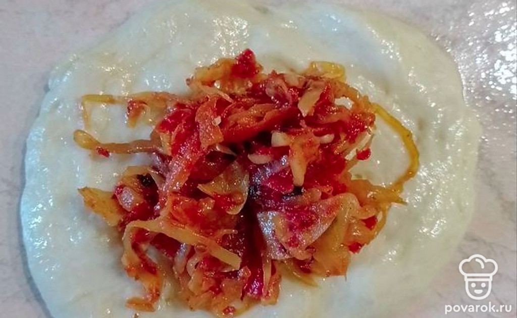 Выложите к овощам измельченную капусту. Тушите до готовности. Раскатайте кружочки из теста и выложите начинку.