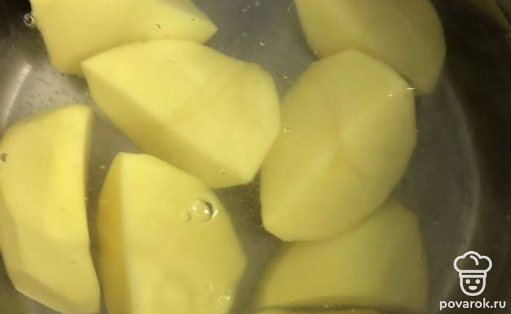 Очистите от кожуры и разрежьте на четыре части картошку, залейте водой, посолите и отправьте вариться до готовности.