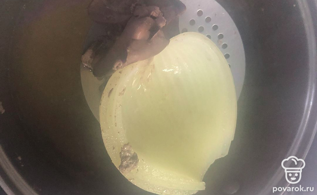 В кастрюлю к печенке положите головку репчатого лука.