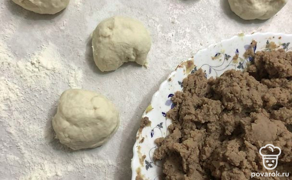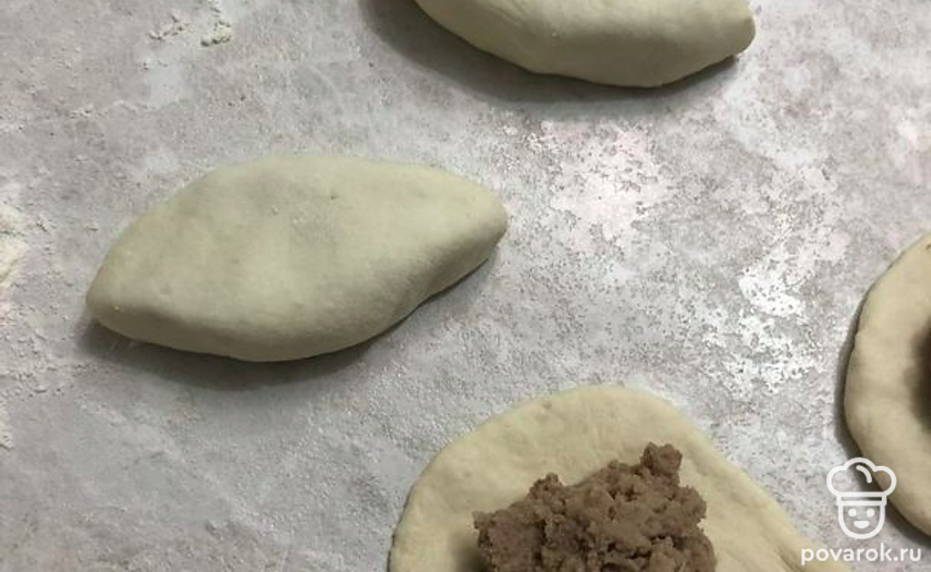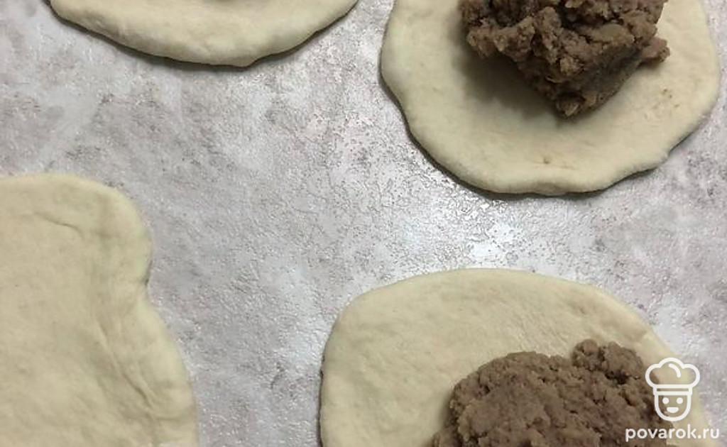 Раскатайте колобки в тонкие лепешки, выложите на середину лепешки начинку (по столовой ложке с горкой).