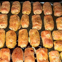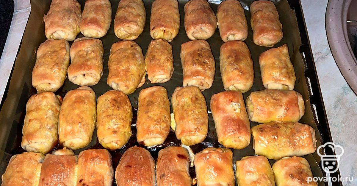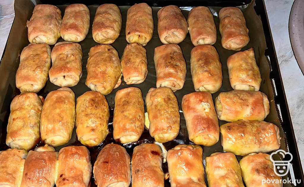 Разделить тесто на 15 шариков. Раскать из них тонкие пласты. Слепить пирожки. Застелить противень пергаментной бумагой, выложить пирожки. Выпекать при 200 градусах 35-40 минут.