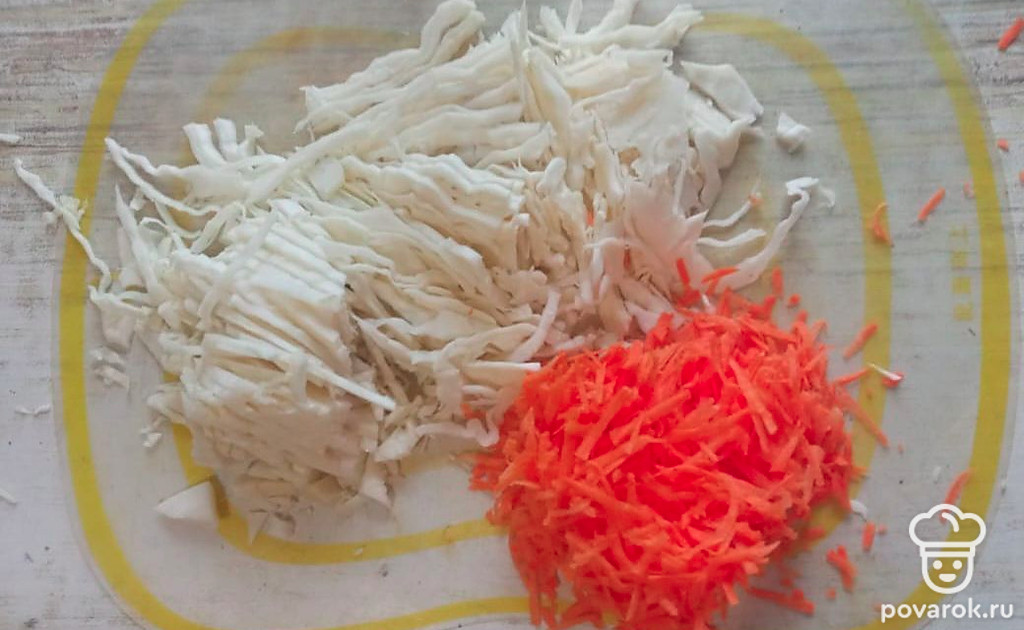 Нарежьте капусту. Морковь натрите на терке. Положите на сковороду с небольшим количеством растительного масла.