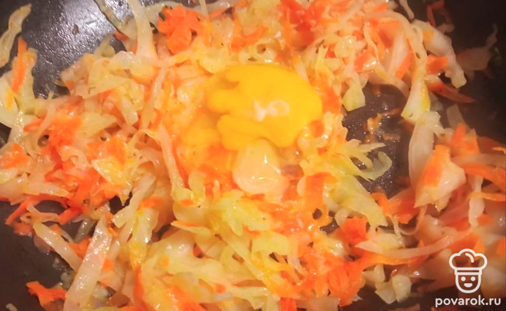 Накройте крышкой и тушите 15 минут. Добавьте яйцо. Перемешайте, посолите по вкусу.