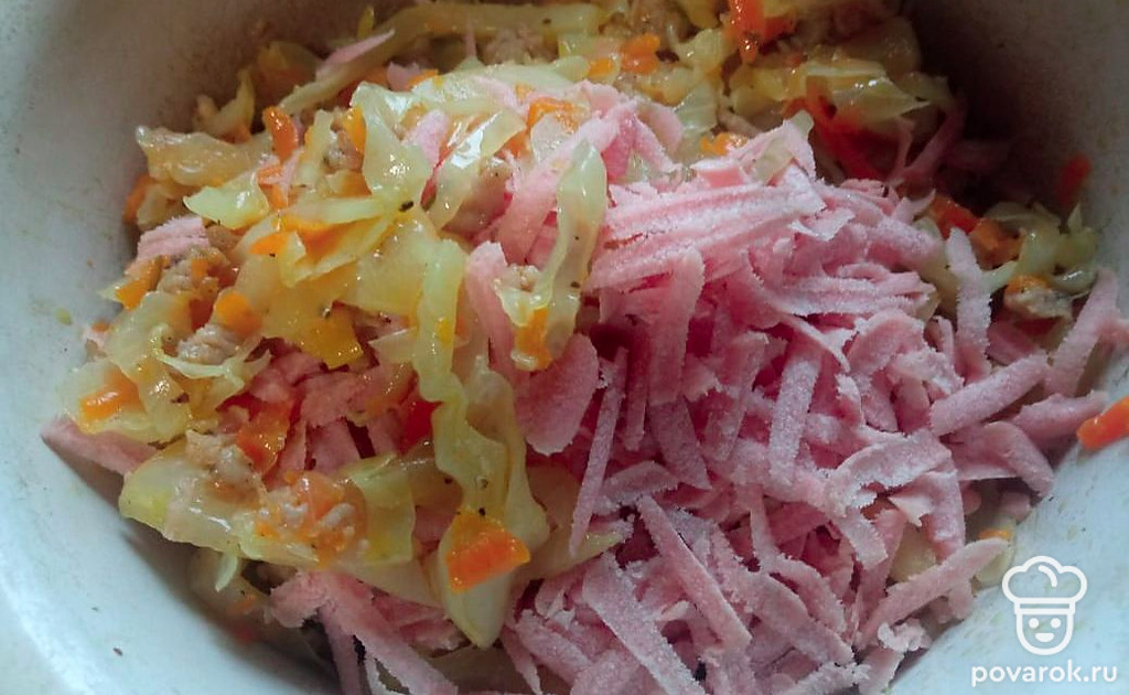 Выложите измельченные на терке сосиски. Перемешайте.