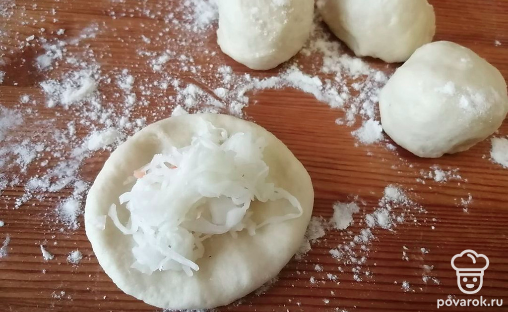 Шарик теста разминаем и выкладываем на него квашеную капусту.