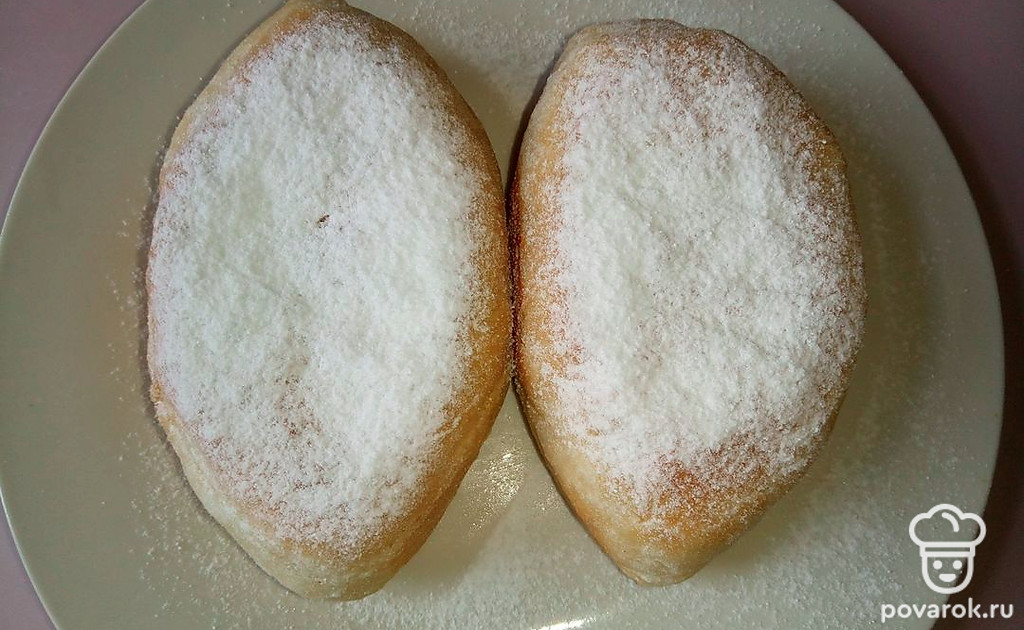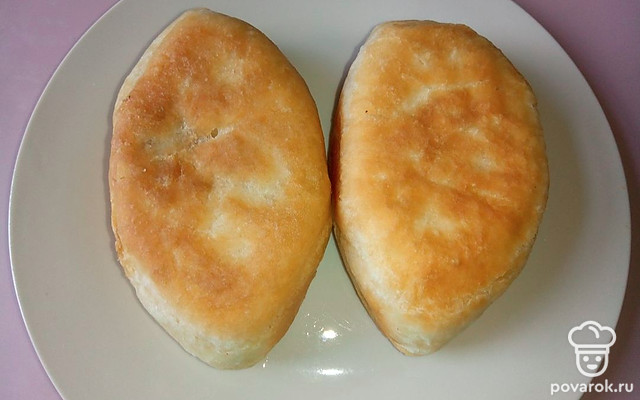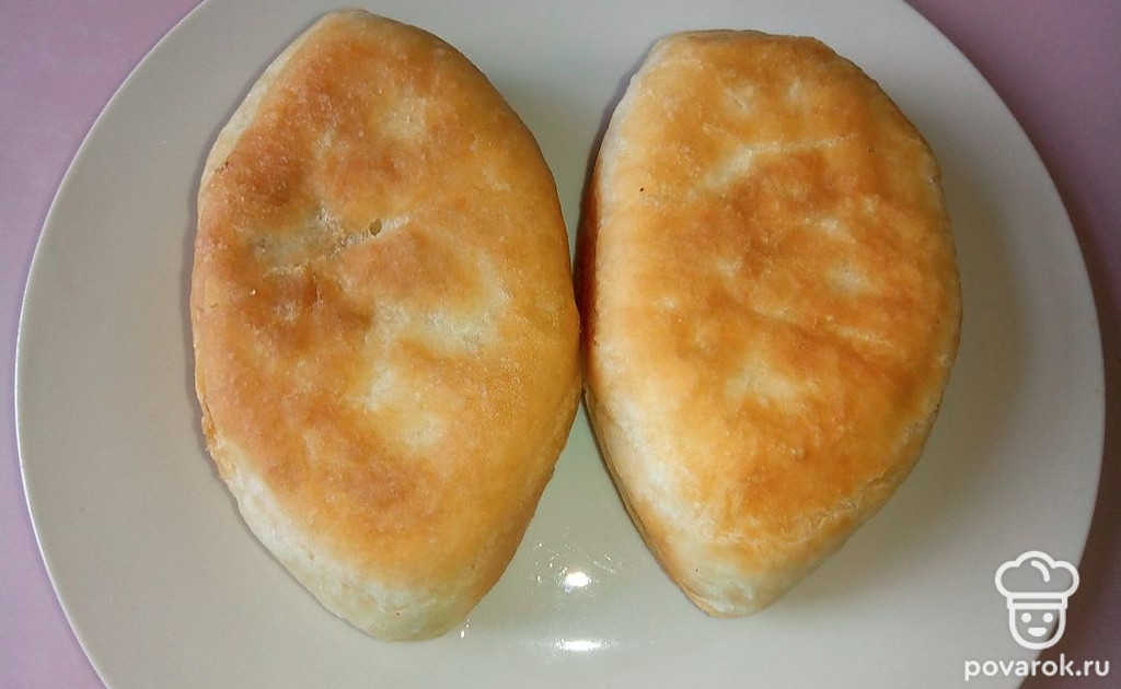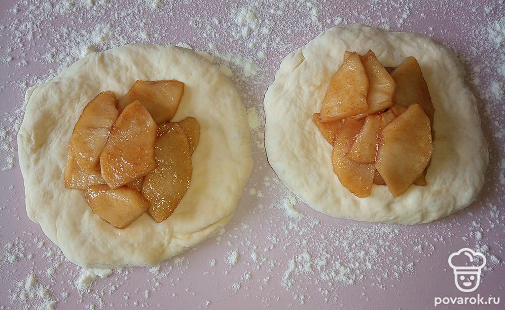 Положите яблочную начинку в центр лепешки. Соедините края левой стороны теста с правой стороной, и защипните края по центру. Поправьте форму пирожков руками, если требуется. Обжаривайте на достаточном количестве разогретого растительного масла до румяного состояния с каждой стороны.