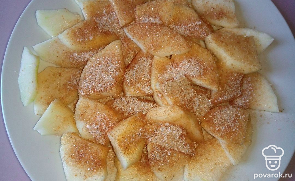 Яблоки нарежьте небольшими кусочками и посыпьте сахаром и молотой корицей. Разогрейте сковороду, добавьте сливочное масло и обжарьте слегка яблоки с сахаром и корицей. Добавляйте понемногу воду и тушите до готовности, помешивая.