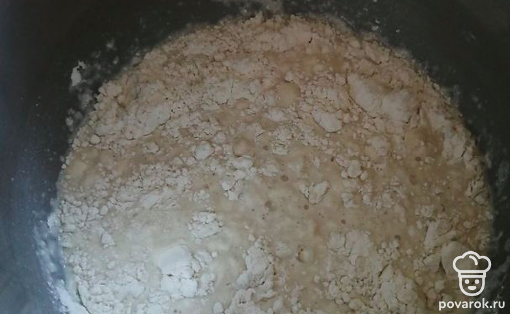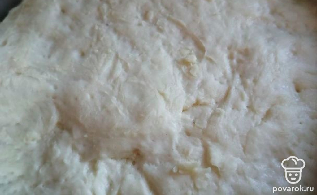 В опару добавить 150 граммов теплого отвара и майонез. Всыпать половину муки и тщательно перемешать. Влить 2 столовые ложки подсолнечного масла и еще раз перемешать. Добавить оставшуюся муку и 1 столовую ложку растительного масла. Тщательно вымесить тесто, накрыть и оставить на 1 час.