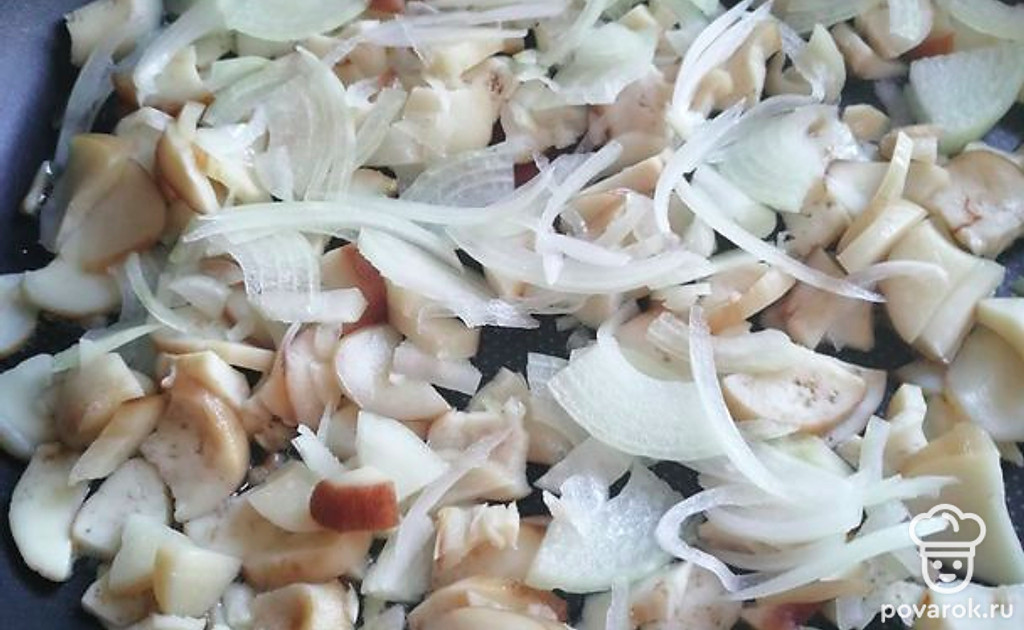 Белые грибы и лук нарезать и обжарить на растительном масле, посолить.