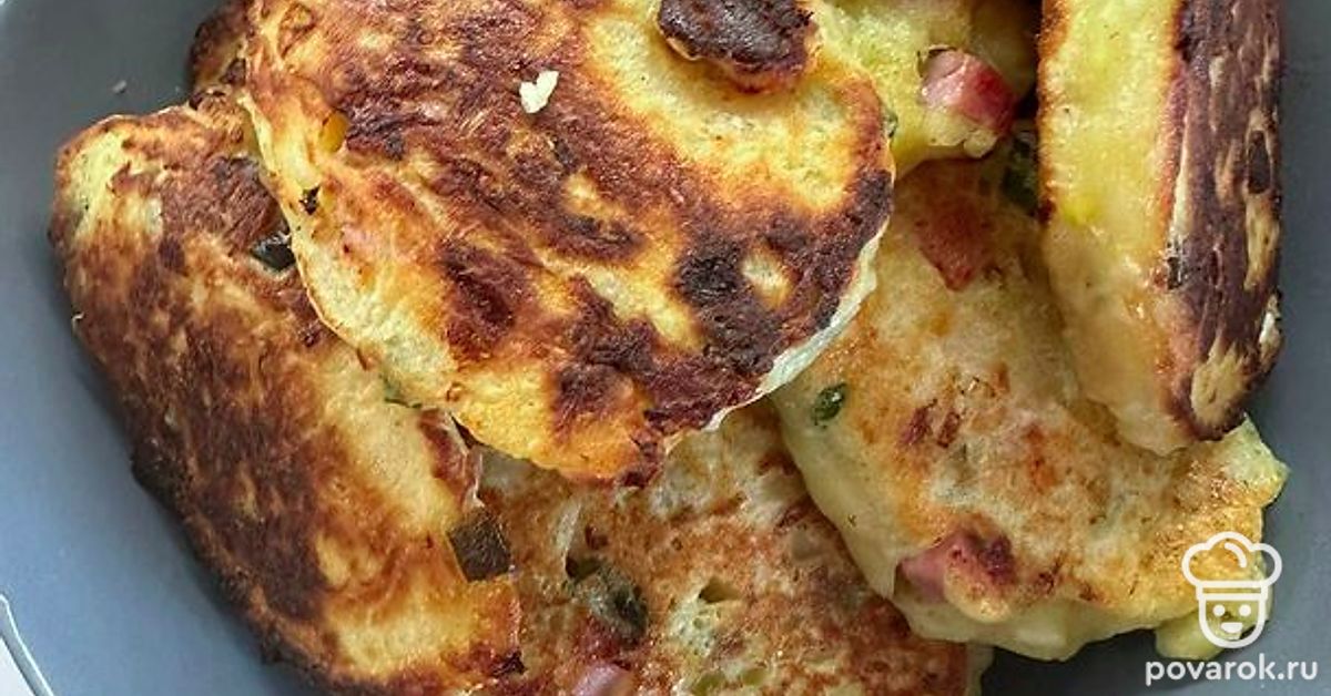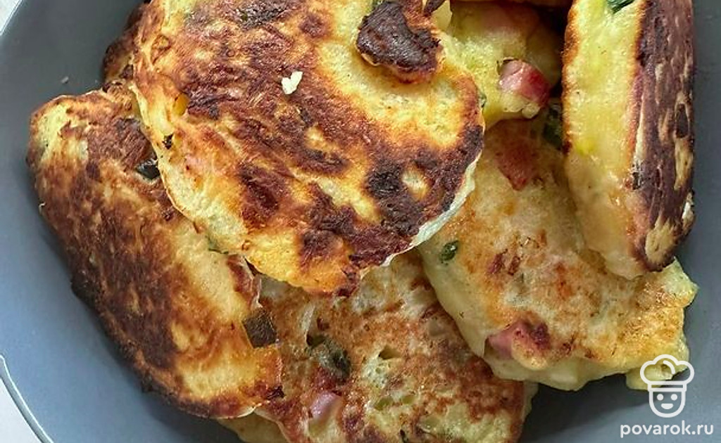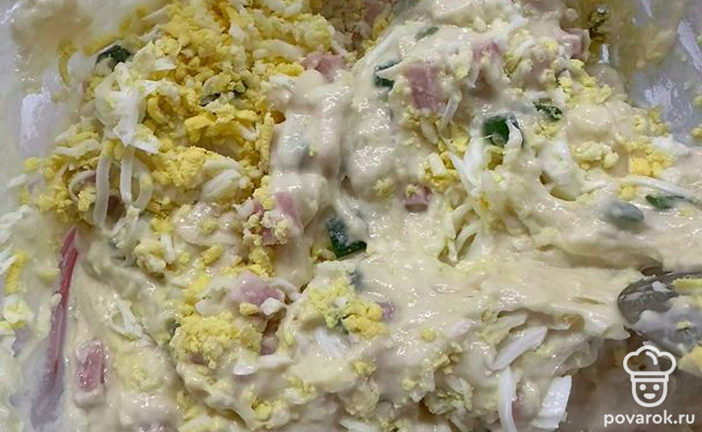 К тесту добавляем колбасу и зеленый лук. Сыр и яйцо отваренное измельчаем на терке и все перемешиваем.