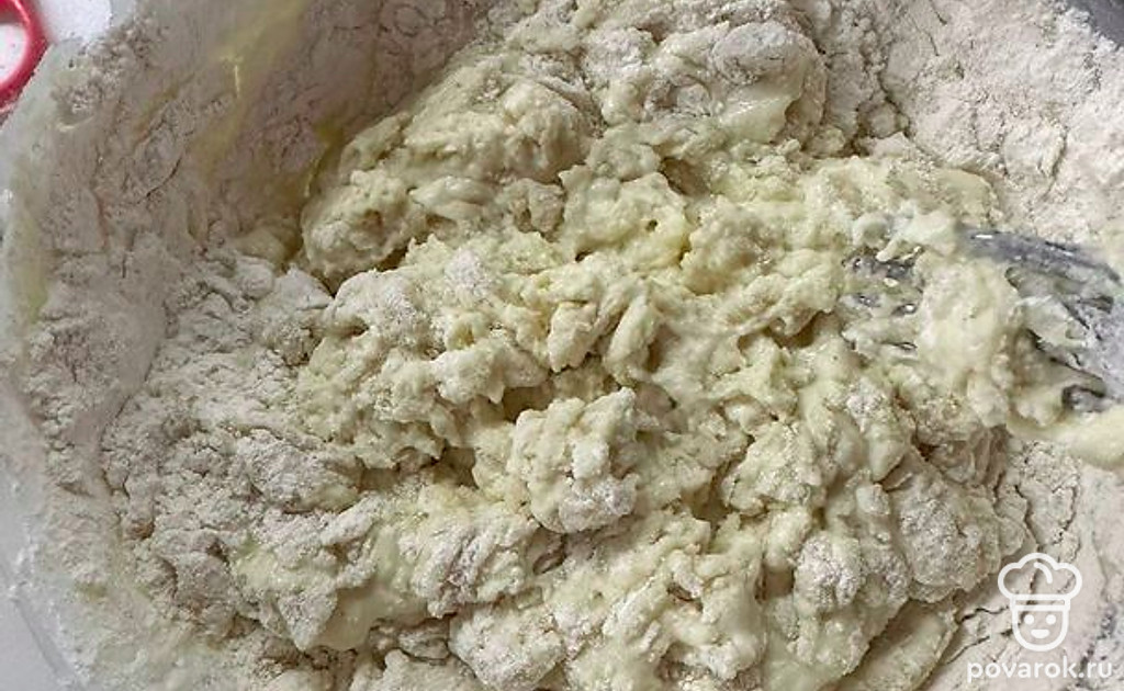 К кефиру добавляем яйцо, масло и соль. Перемешиваем. Высыпаем муку и разрыхлитель, перемешиваем.